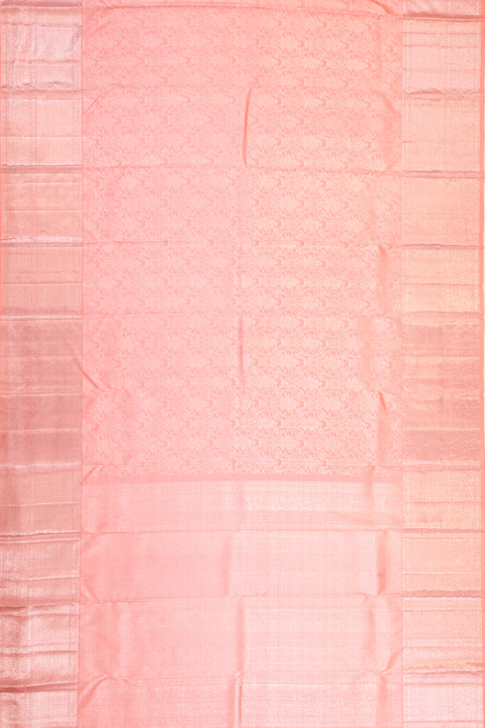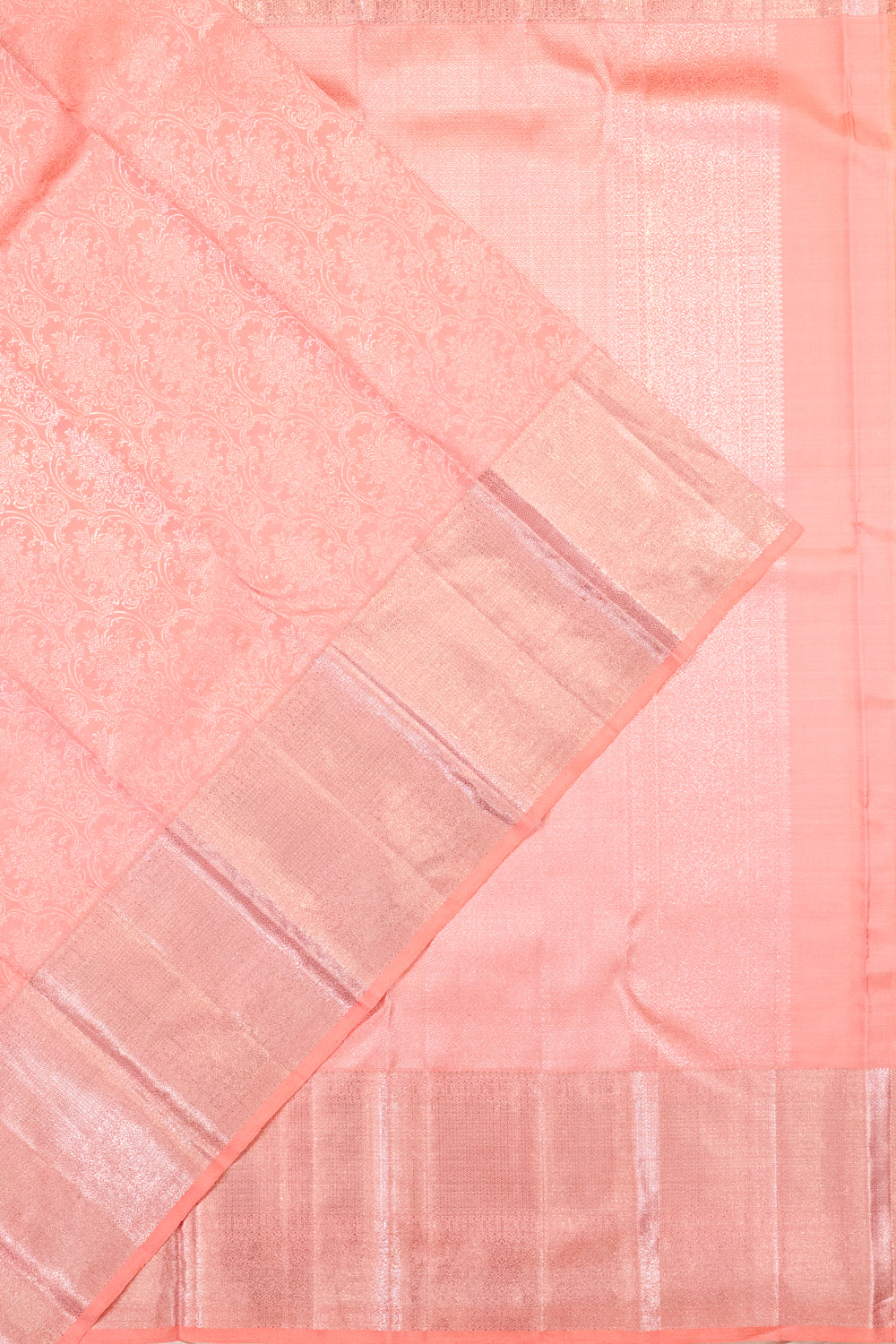 The medium border, adorned with self silver zari floral motifs, seamlessly blends with the saree, creating a harmonious flow