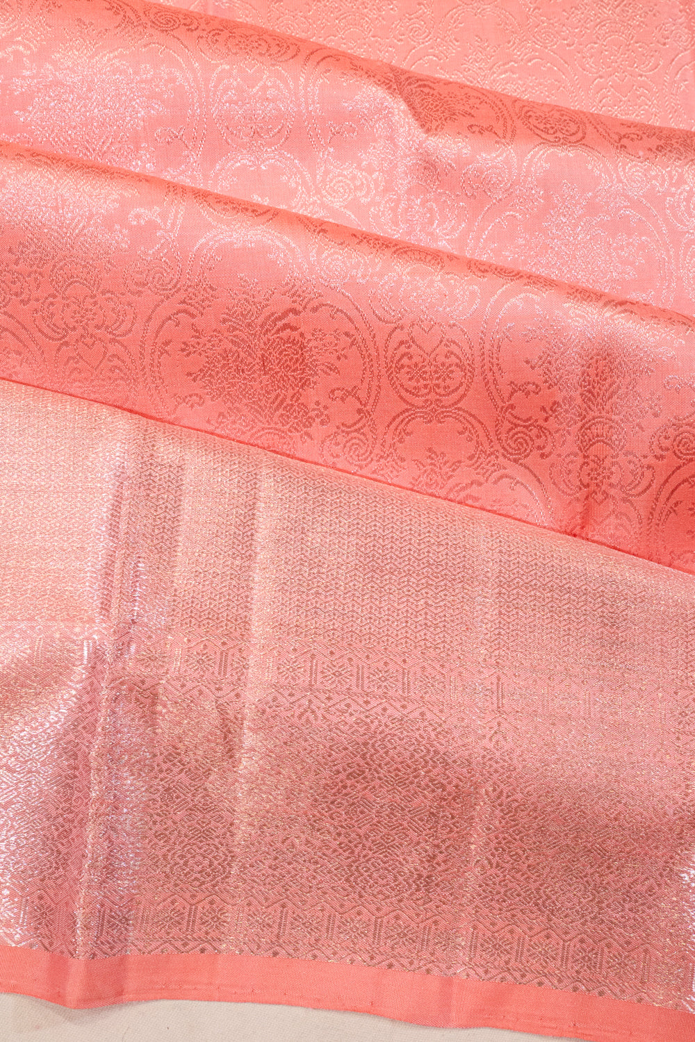 The saree's body features a delicate silver zari floral brocade that gracefully dances across the luxurious silk, offering a mesmerizing shimmer that captures the essence of tradition