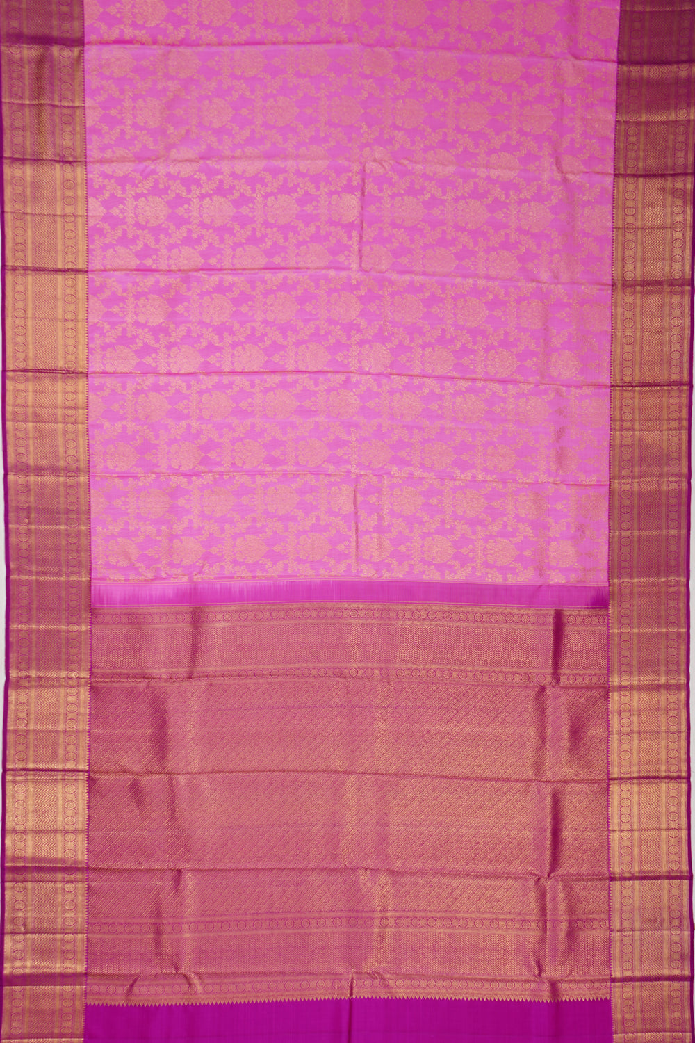 The self gold zari medium border gracefully frames the saree, adding a touch of opulence and sophistication to its elegant pink canvas