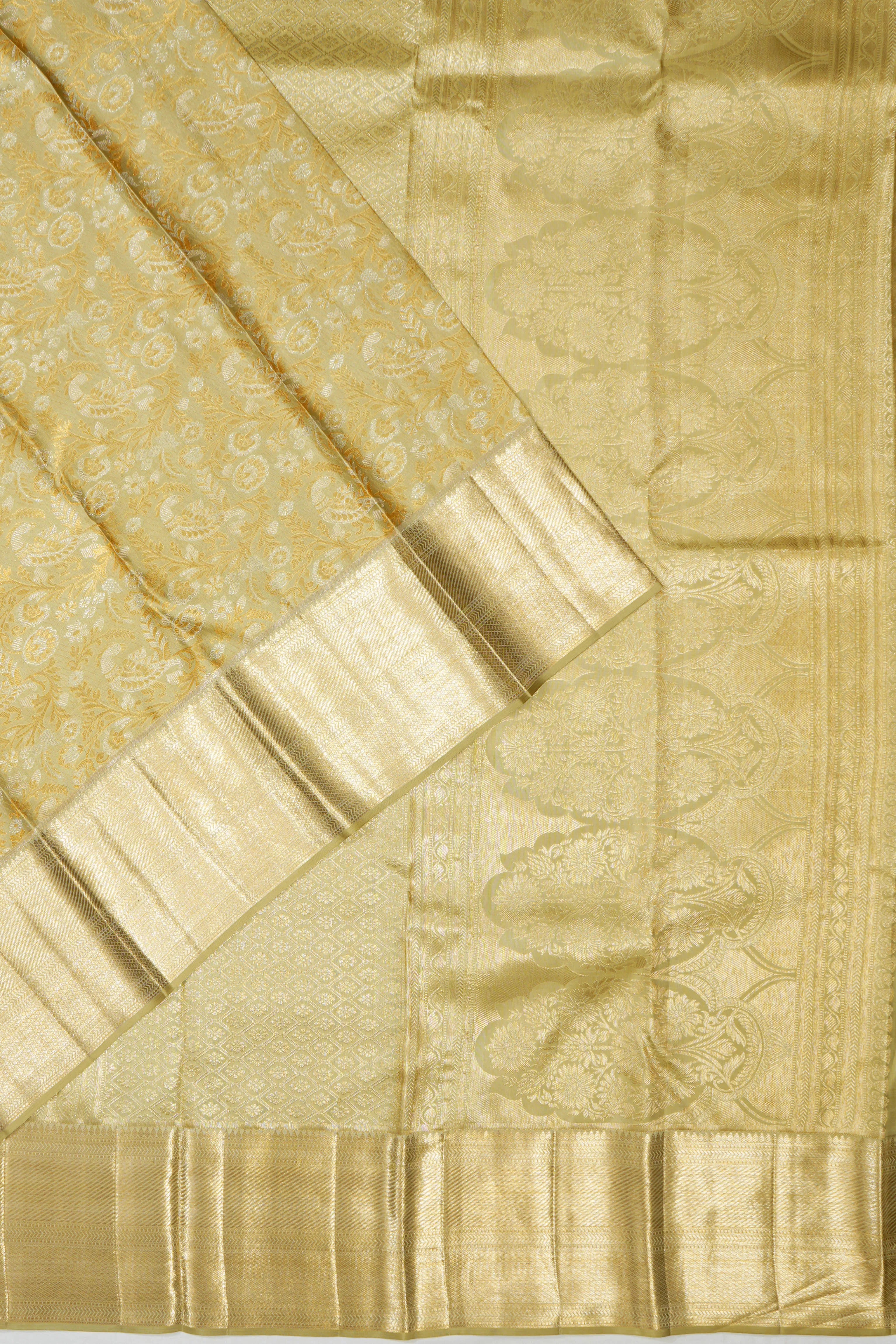 Body: This pista green saree is adorned with gold and silver zari floral brocade, creating a harmonious blend of classic gold with delicate silver floral patterns, exuding sophistication and charm.