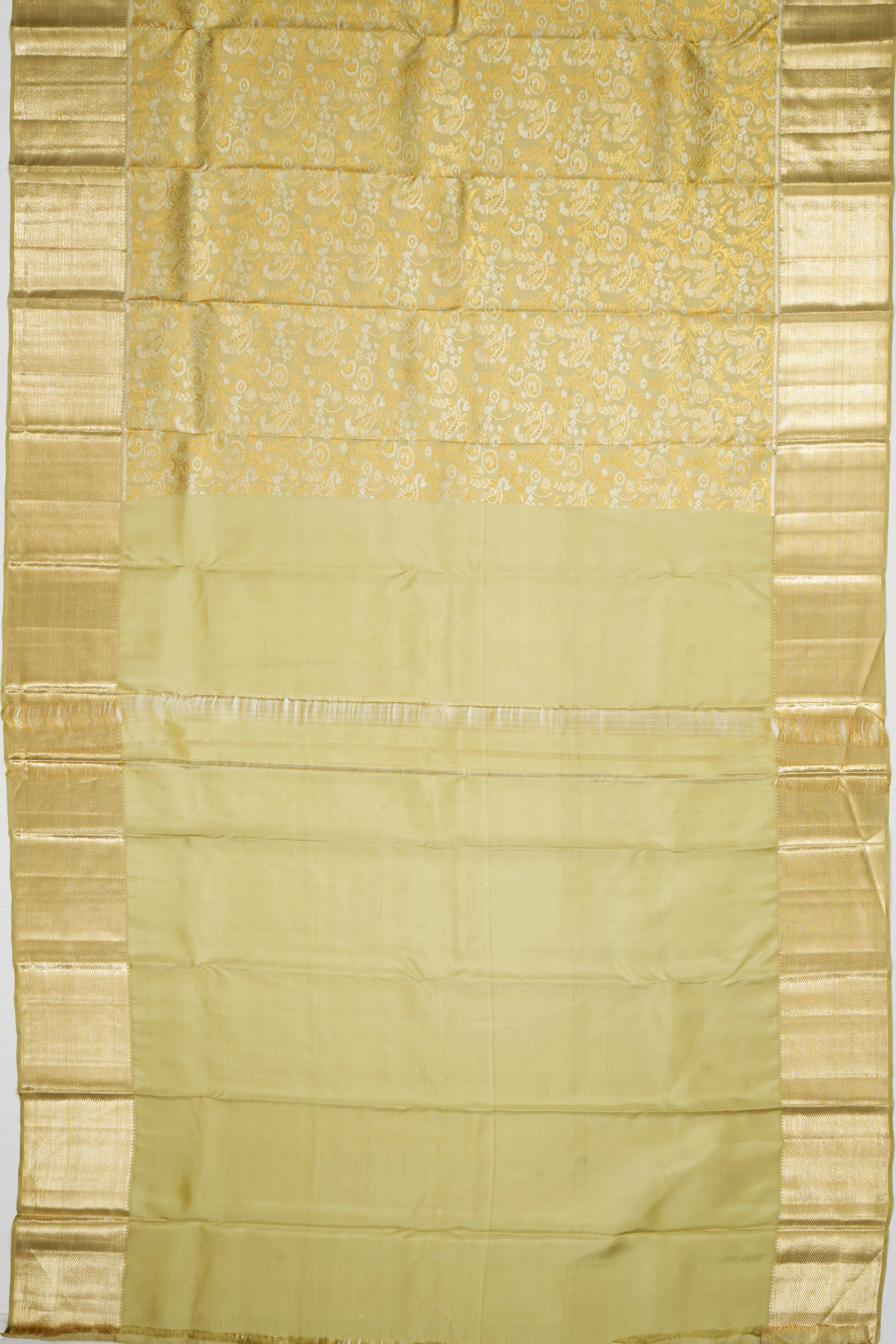 The self gold zari floral brocade pallu is rich in detail, with intricate gold floral patterns, complementing the body and adding an opulent touch to the saree.