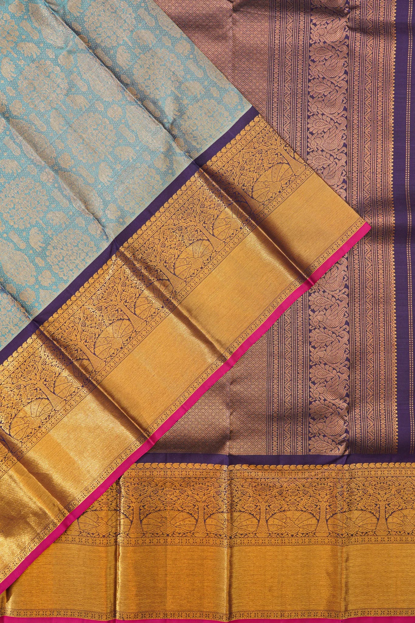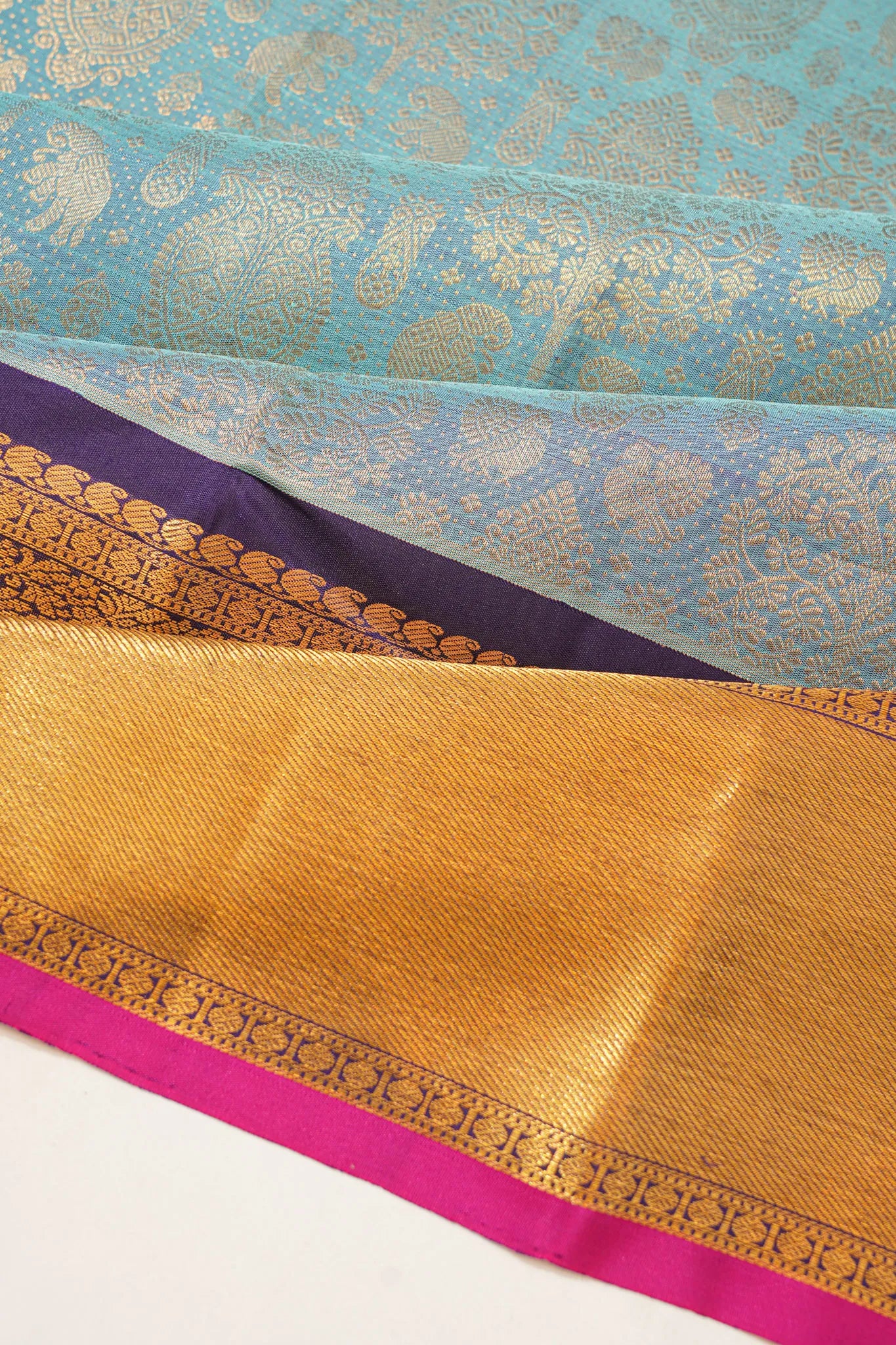 The saree's body showcases an exquisite gold zari floral brocade, artfully interspersed with majestic elephant motifs, creating a tapestry of tradition and elegance