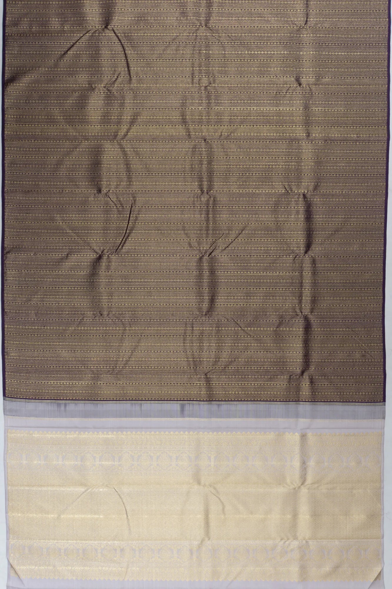 Embrace the allure of tradition with our Kanchipuram Silk Brocade Purple Saree, a masterpiece that exudes grace and heritage The saree's body is adorned with intricate gold zari brocade, featuring the timeless elegance of paisleys and rudraksh motifs, which catch the light with every movement