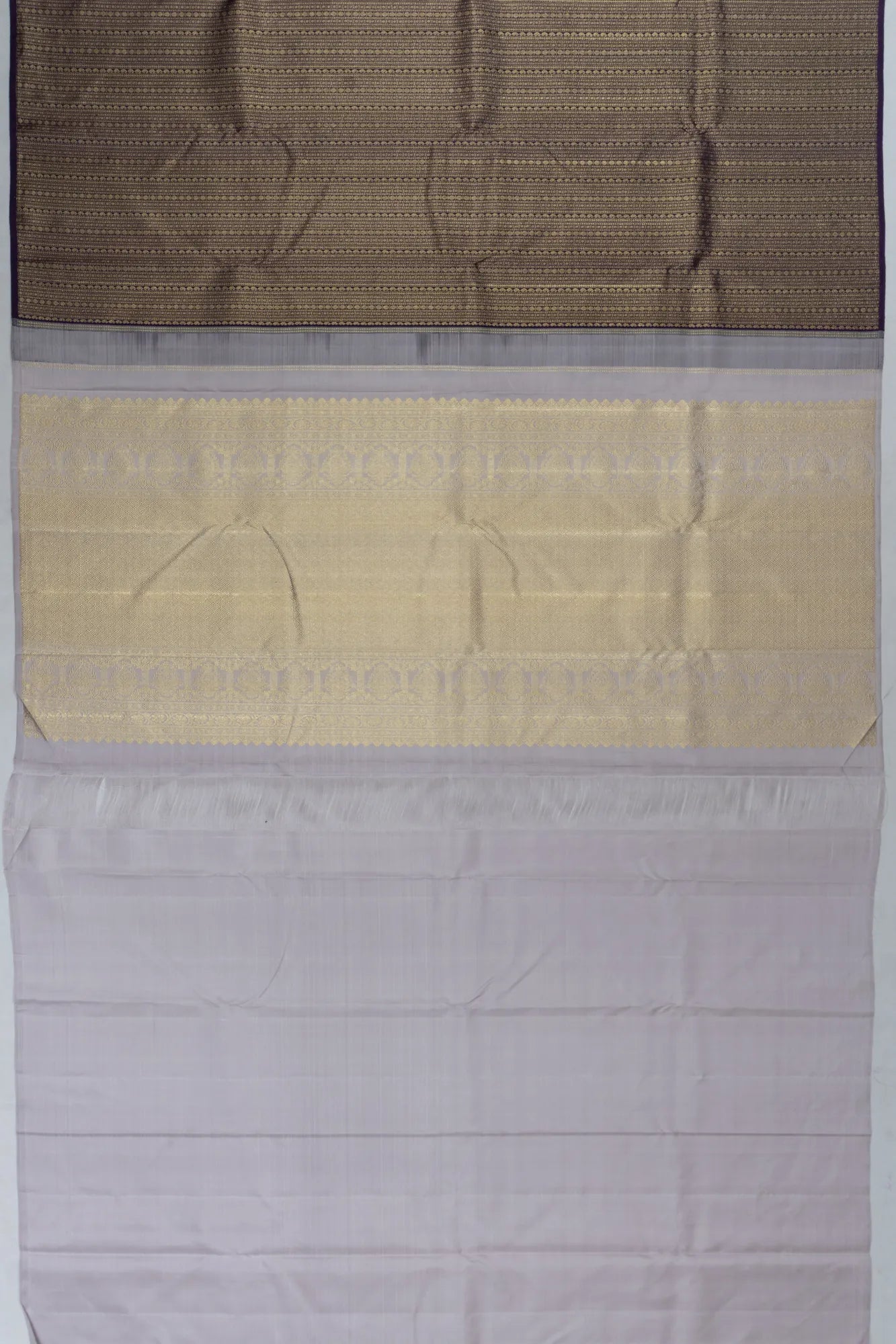 A delightful contrast is offered by the lilac pallu, beautifully woven with gold zari brocade, adding a touch of sophistication to the ensemble