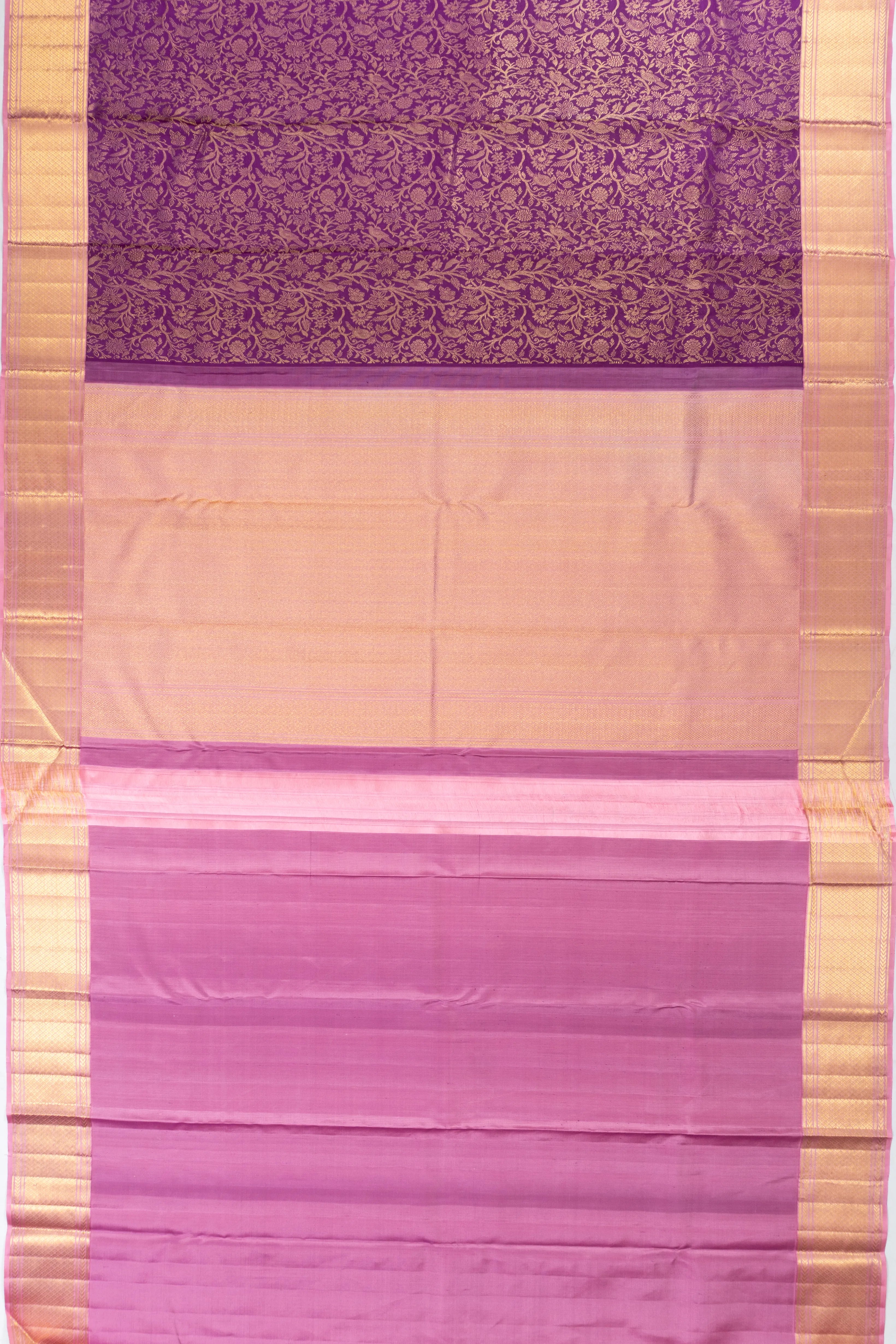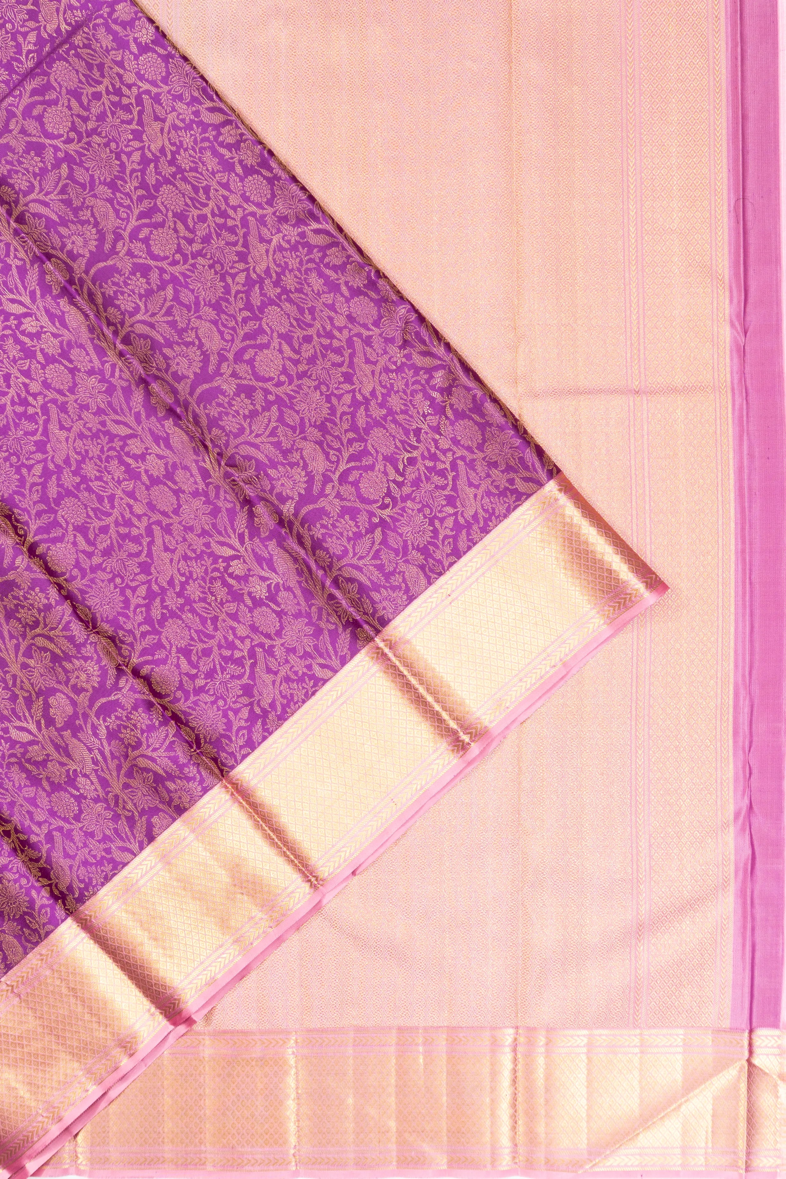 Embrace the allure of timeless tradition with this Kanchipuram Silk Brocade Purple Saree, a masterpiece of heritage-rich craftsmanship The luxurious gold zari floral brocade on the body, interspersed with delicate bird motifs, exudes a graceful charm that captivates the senses