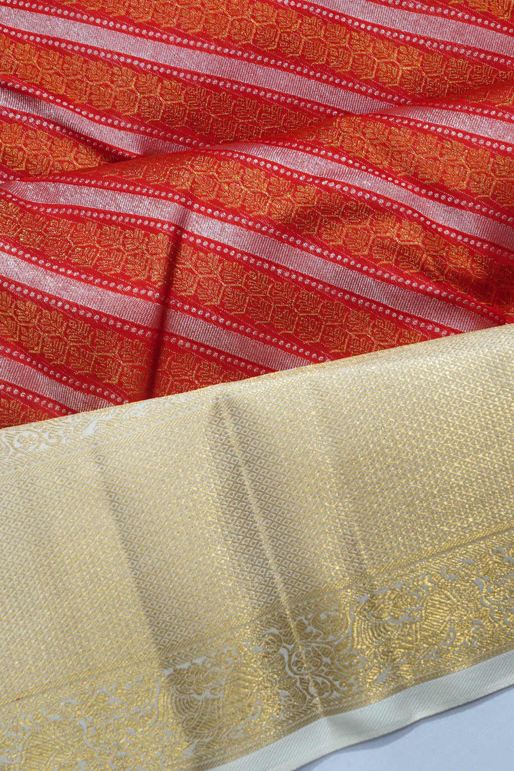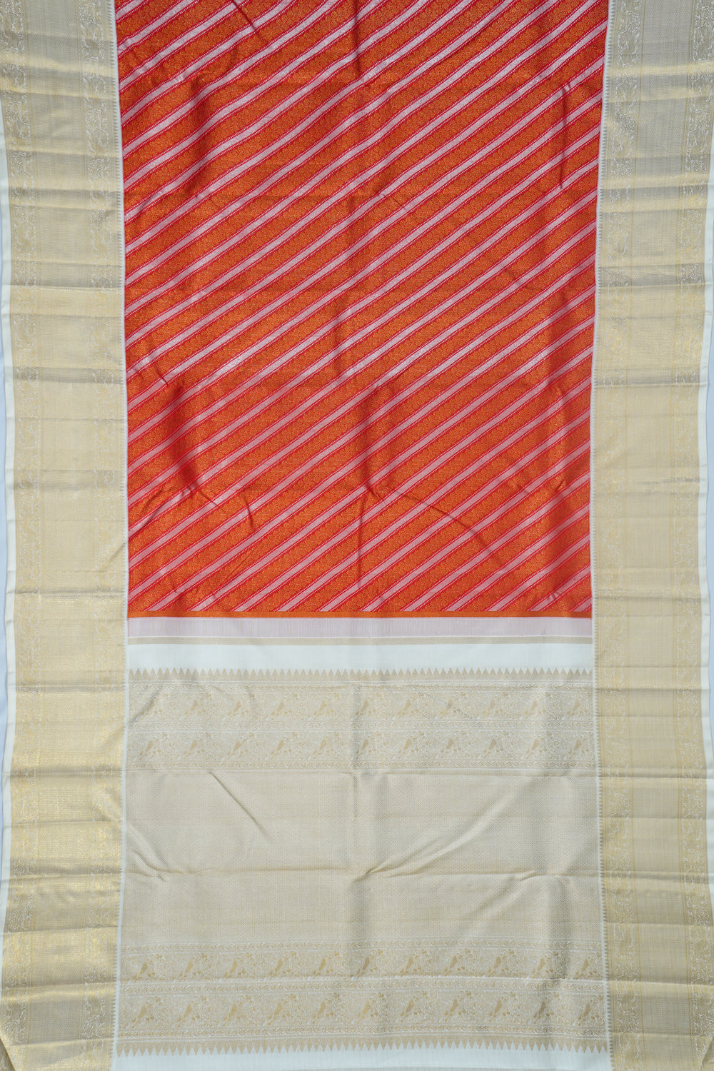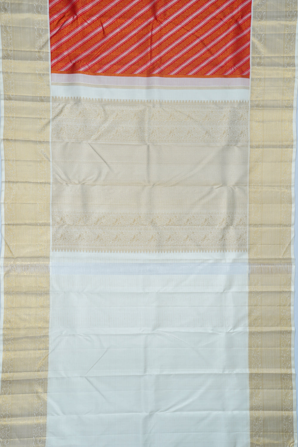 The contrasting gold zari border showcases yali motifs within a floral brocade, framed by a white medium border.