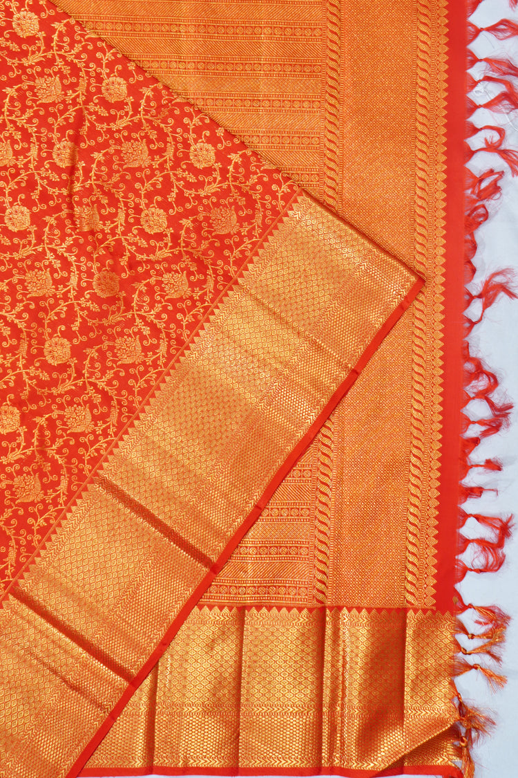 The self gold zari brocade pallu with florals continues the floral pattern, enhancing the saree’s elegance.
