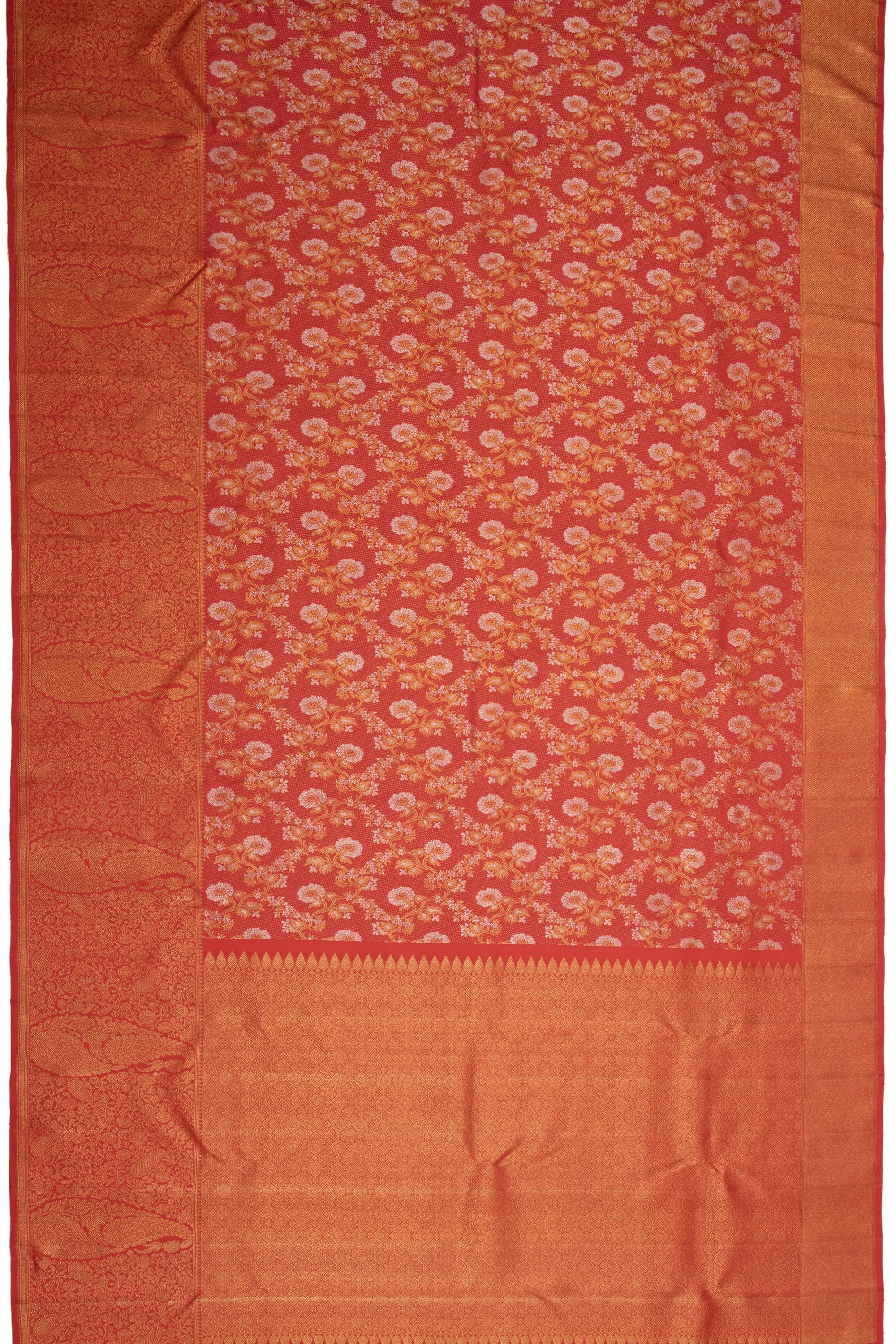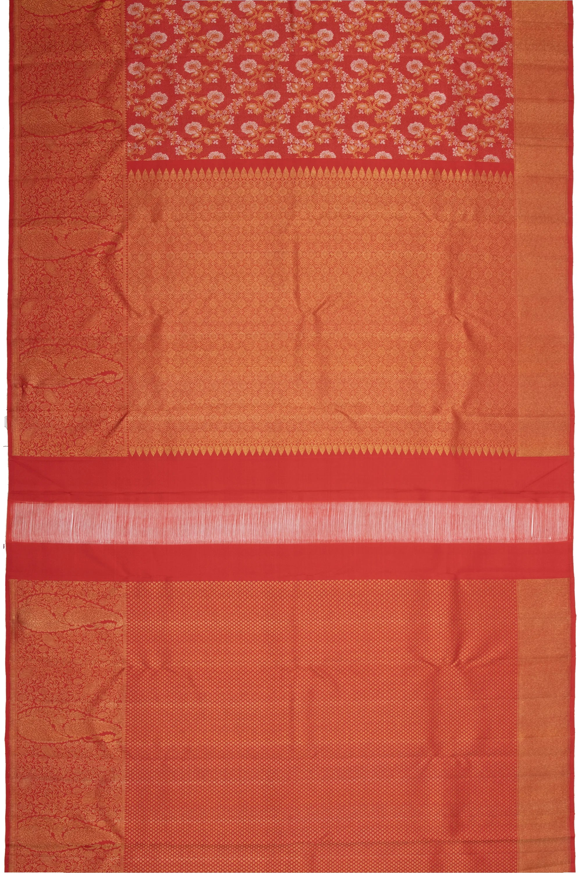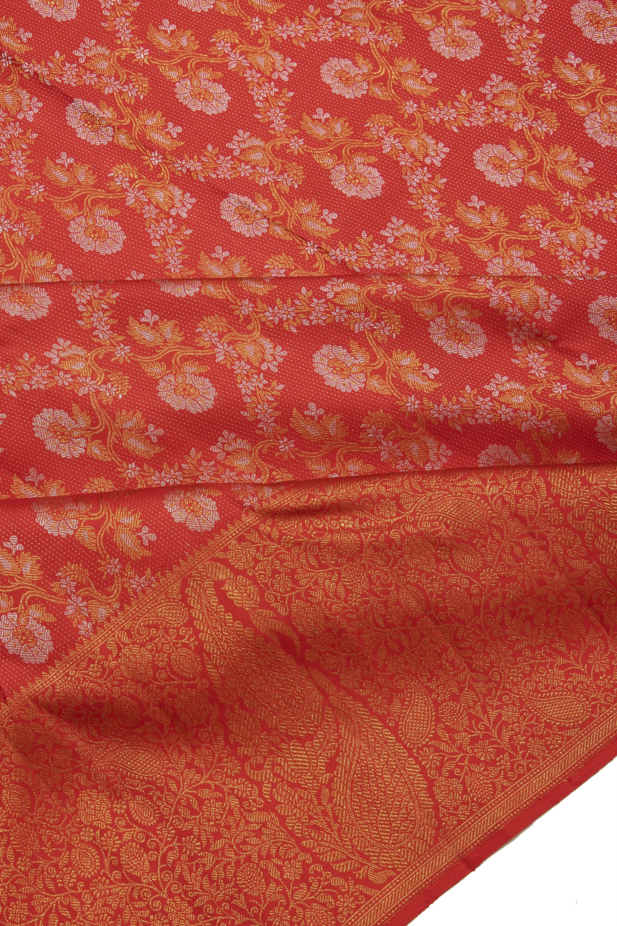 Body: Rich red base woven with exquisite gold and silver zari floral brocade, radiating timeless opulence and intricate craftsmanship.