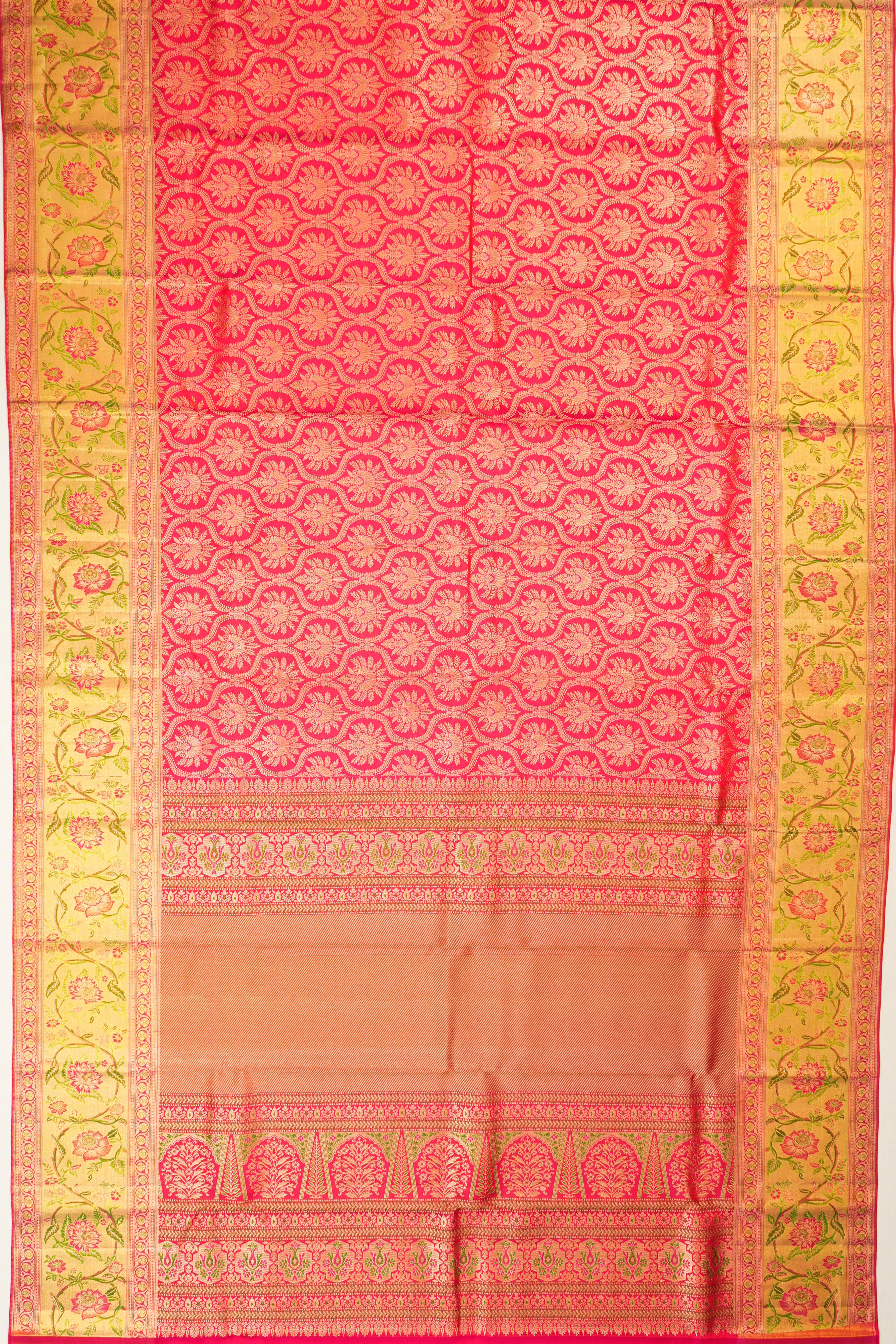 Self gold zari tissue with floral brocade medium border, enhancing the saree's beauty with an intricate and lustrous golden tissue work.