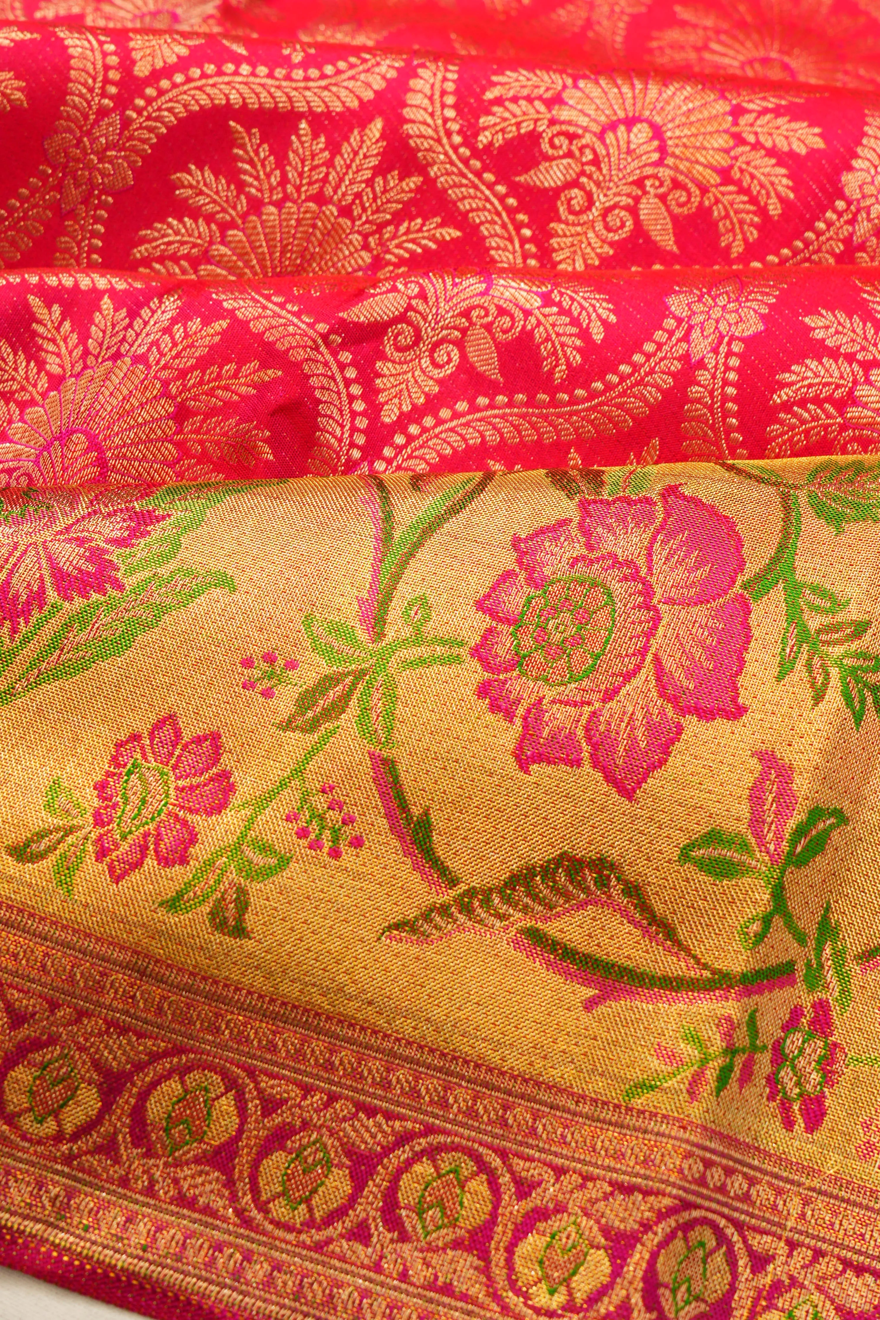 Body: Gold zari floral brocade, featuring intricate floral designs woven in gold zari, creating an elegant, rich texture.