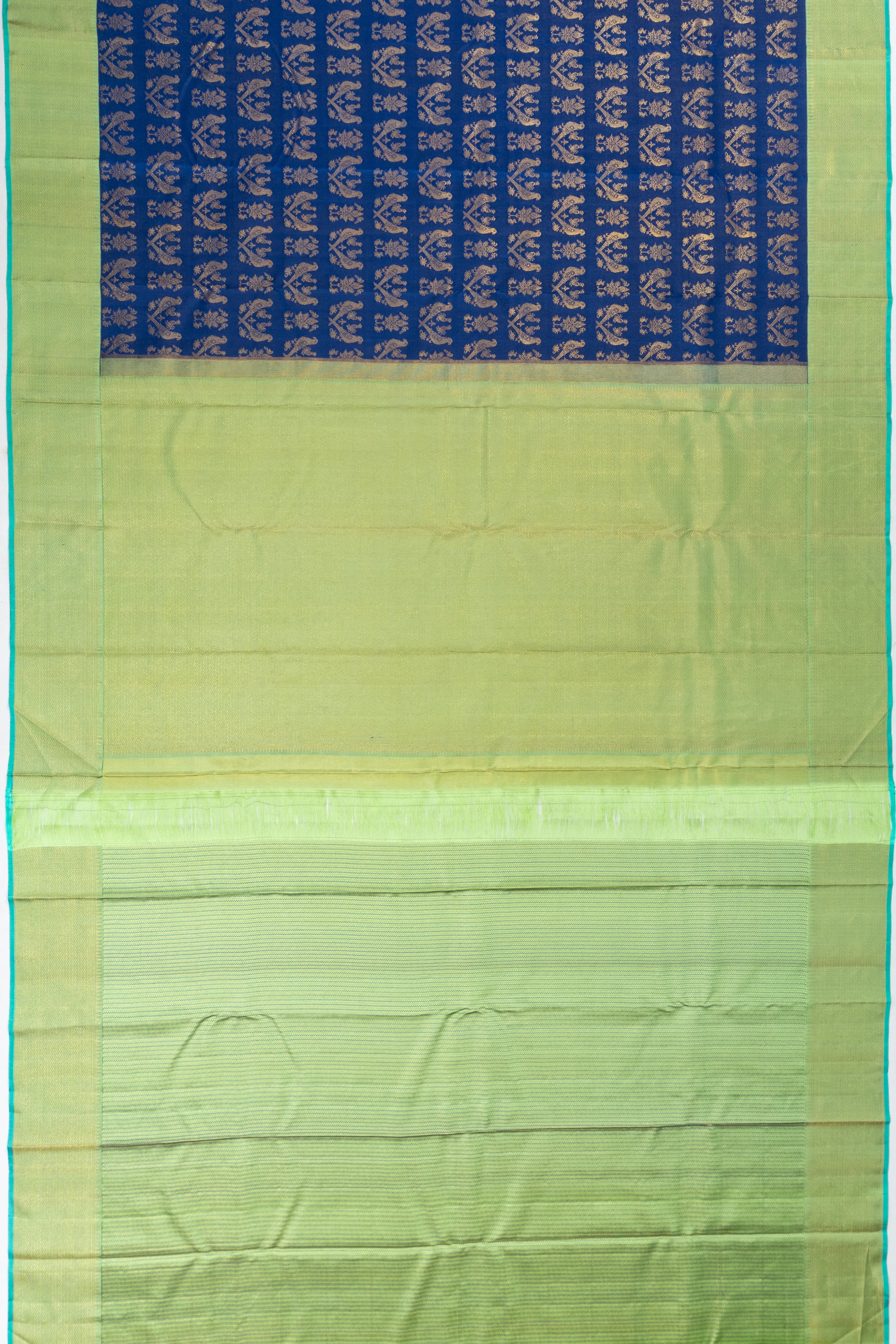 The saree is beautifully framed by a contrast border in sea green, enriched with gold zari brocade and highlighted by a sky blue edge