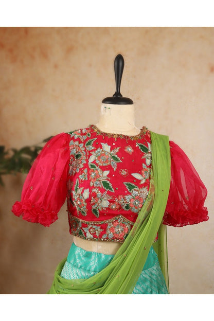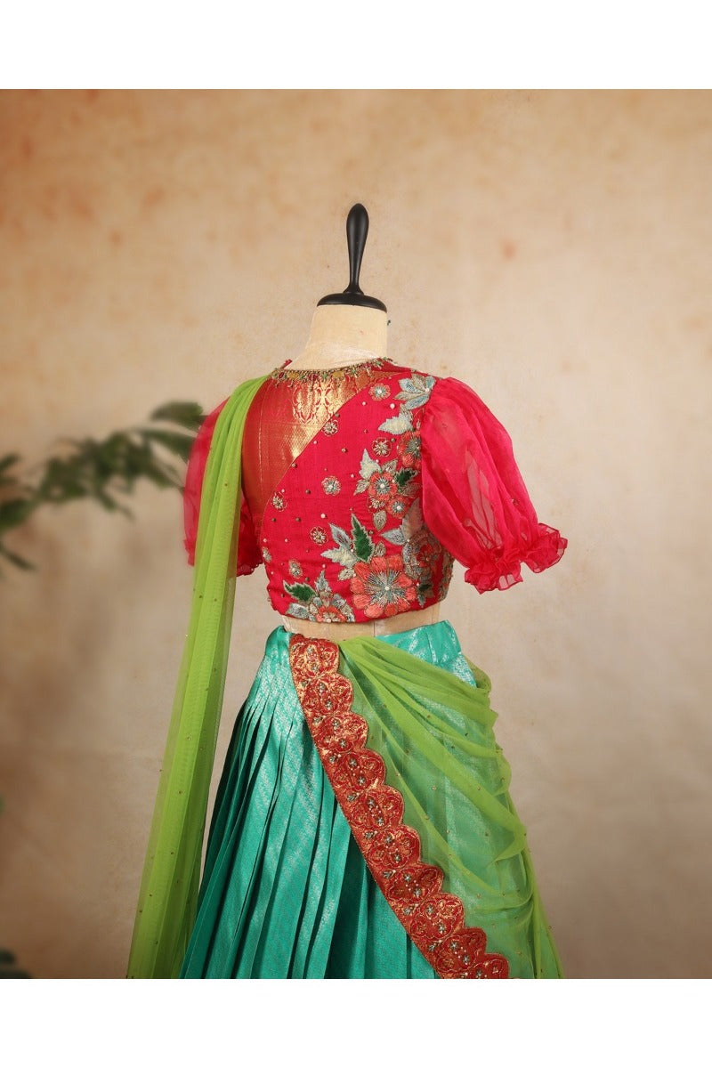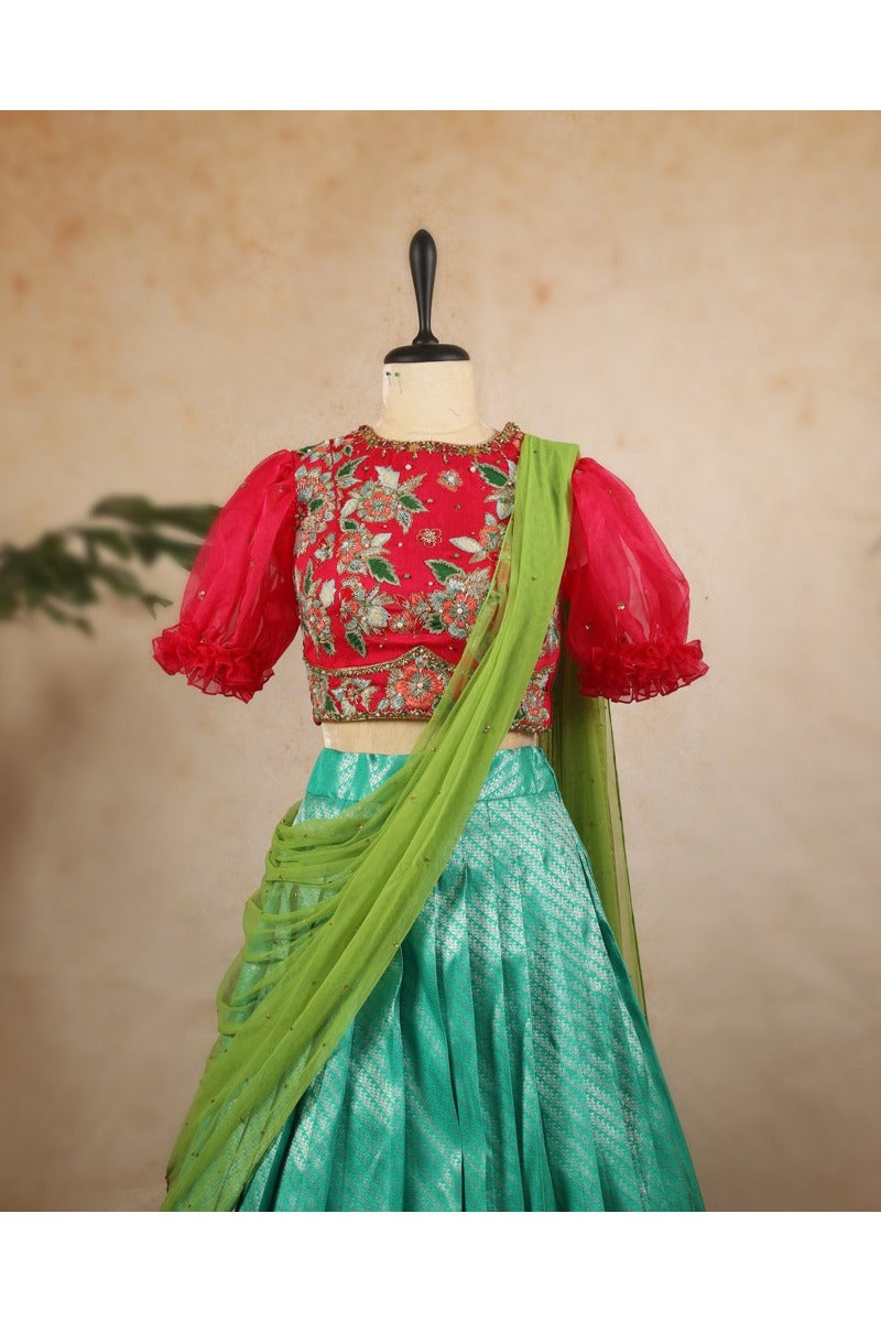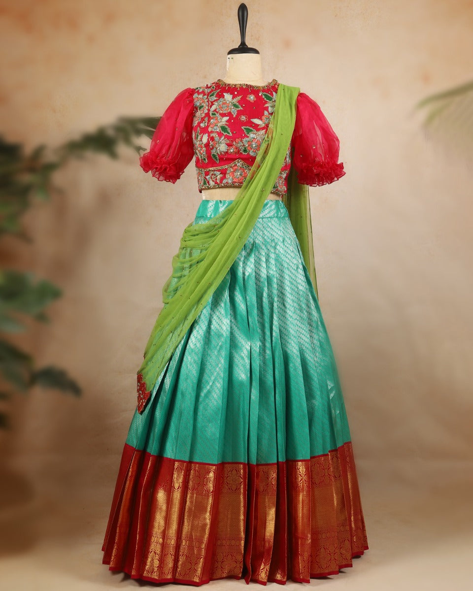 Kanchipuram Silk Brocade Sea Green Lehenga With Tussar Fusion