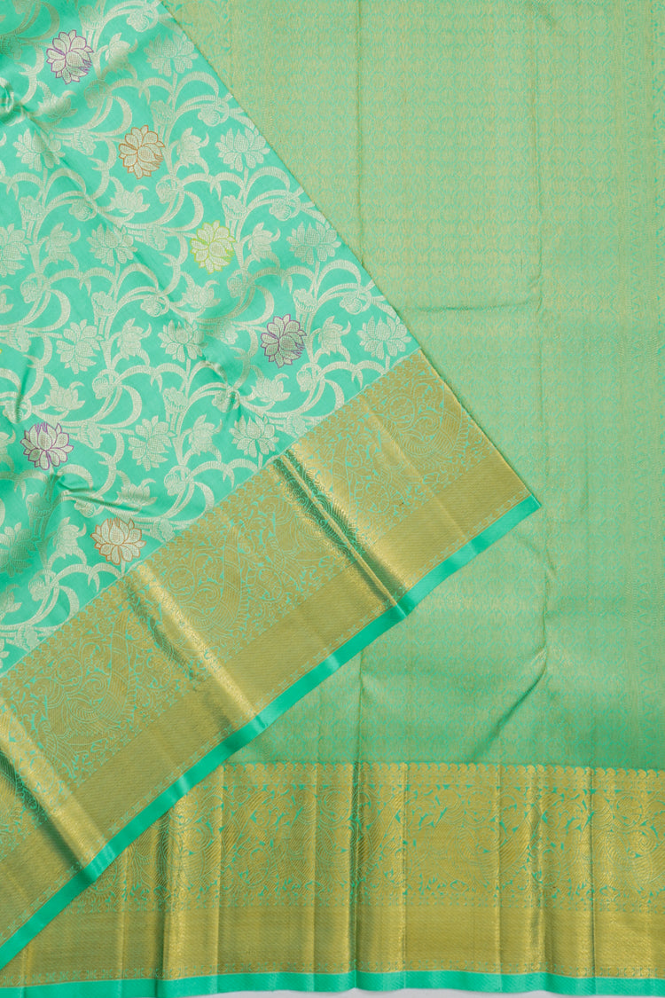 The pallu is adorned with self gold zari floral brocade featuring peacock and elephant motifs, enhancing its traditional charm.