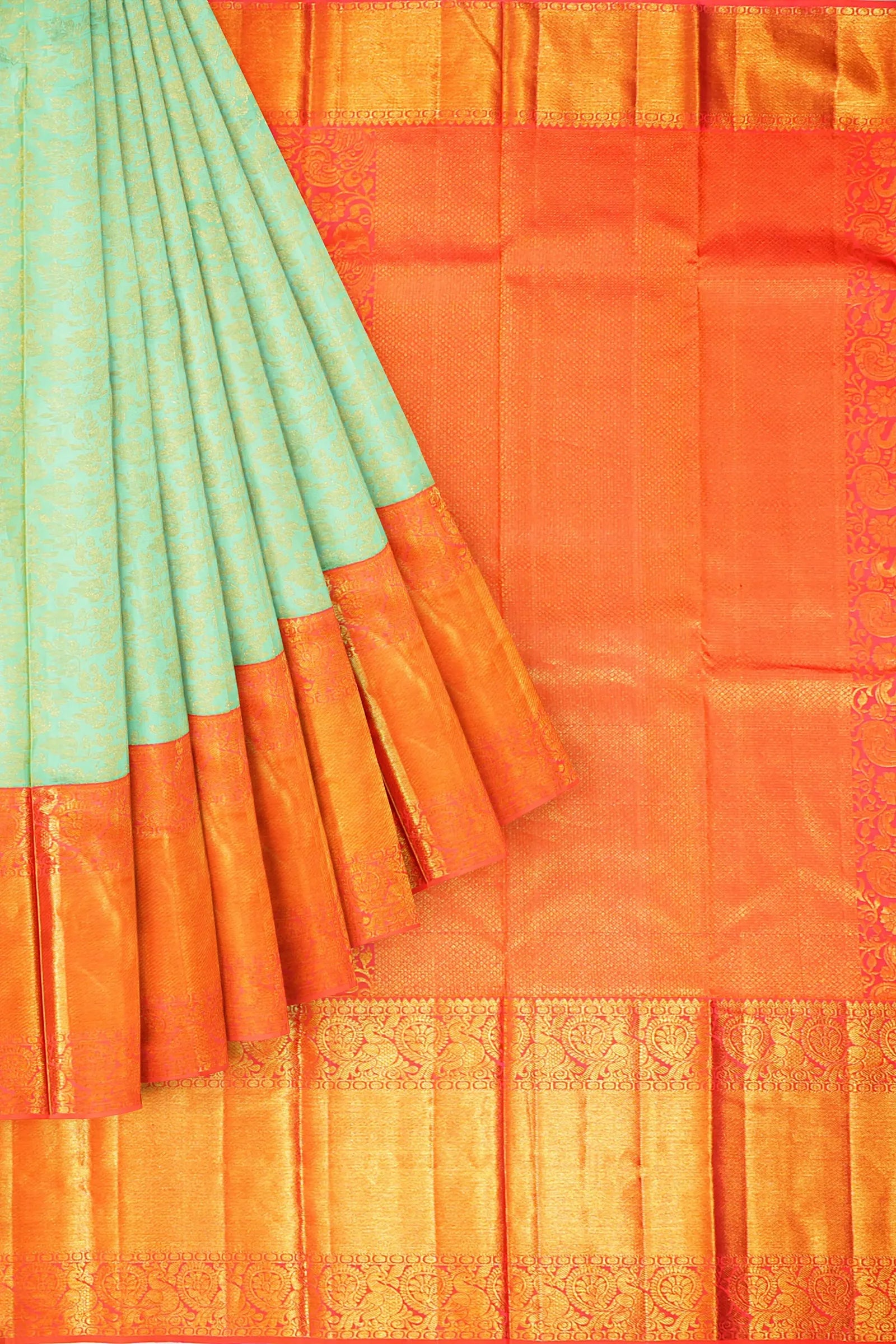 Contrast gold zari brocade pallu with peacock motifs in florals, adding a touch of grandeur and cultural richness to the design.