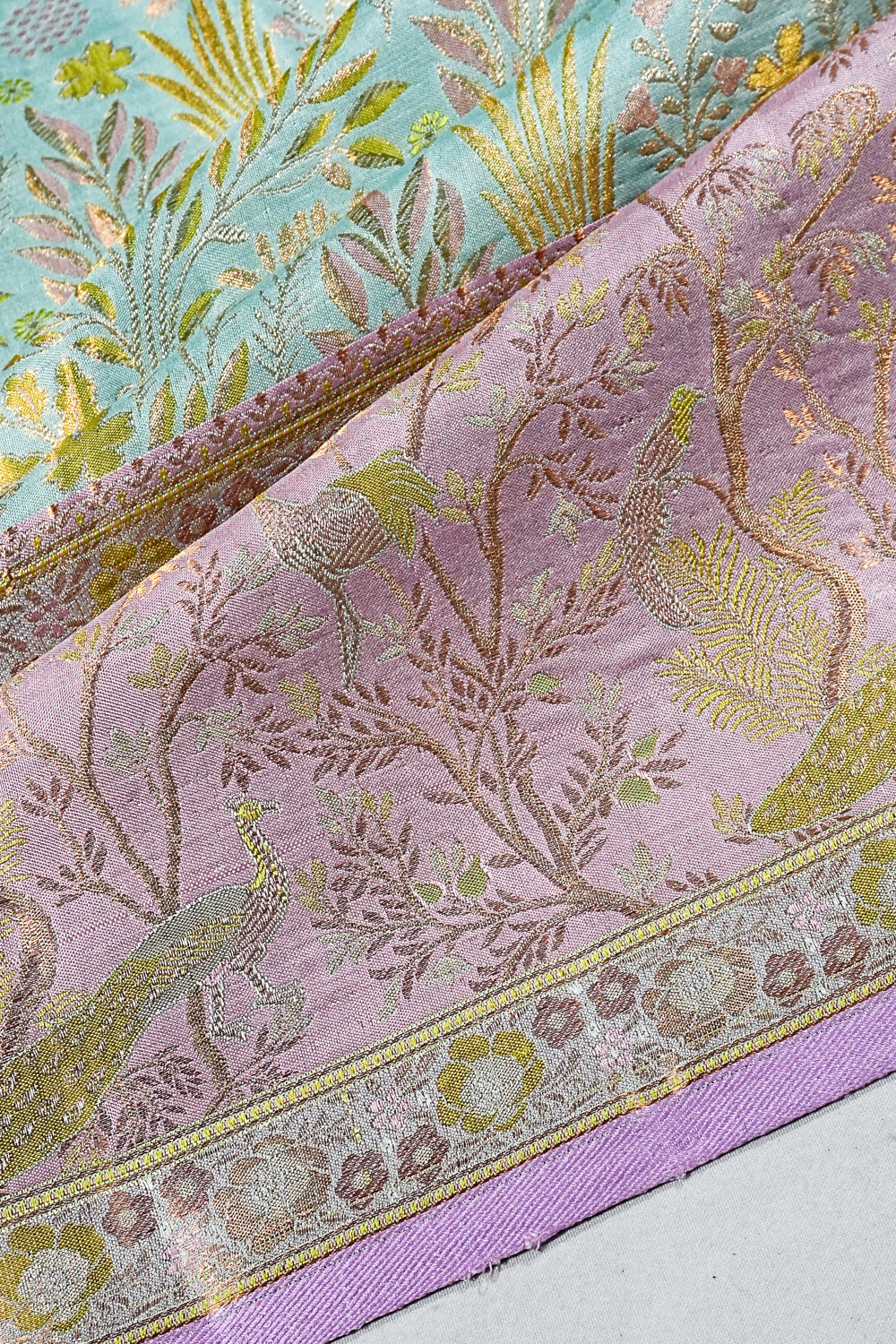 The contrast gold zari floral brocade lavender big border, embellished with bird motifs, introduces a touch of whimsy and richness, highlighting the vibrant colours of the saree.