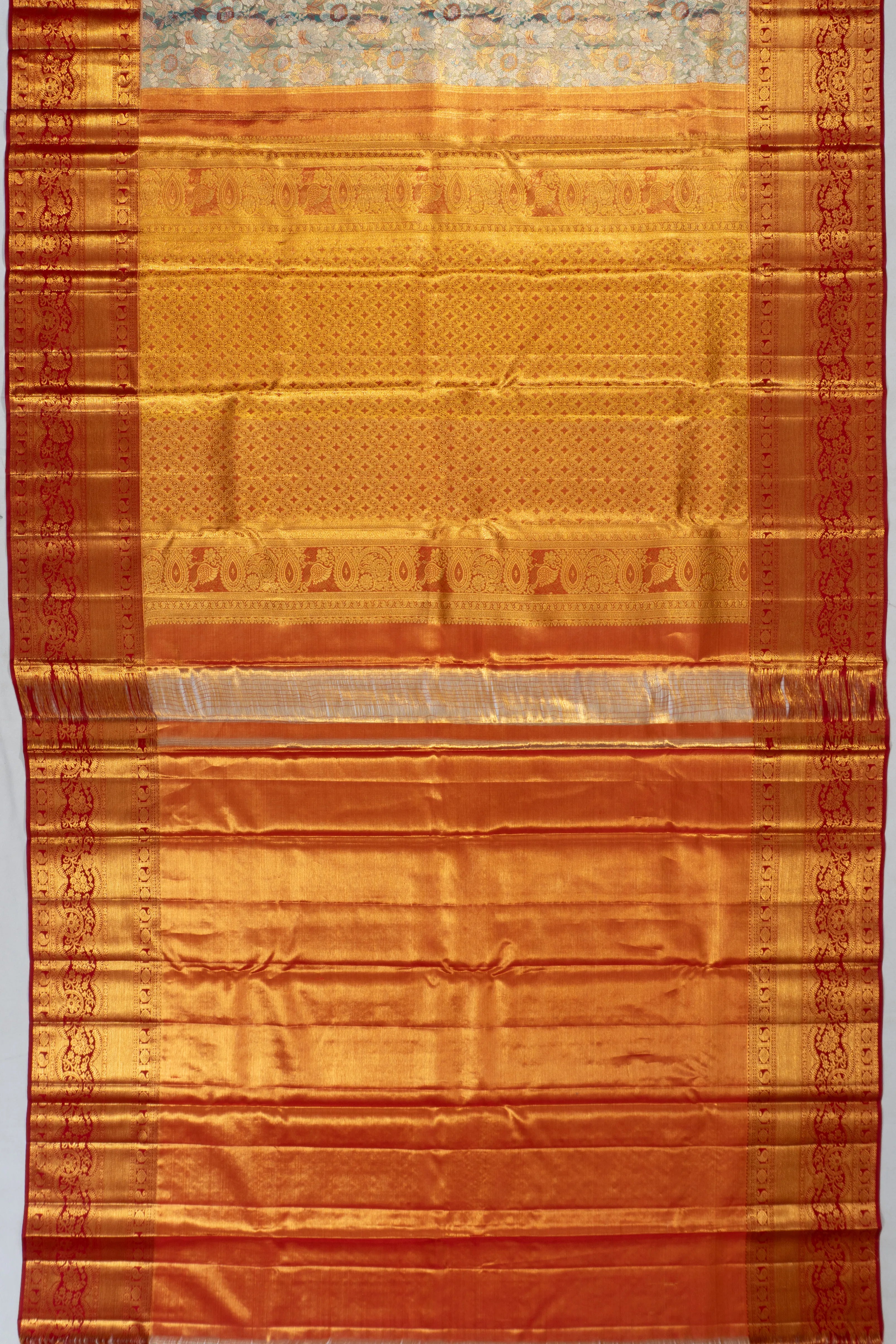 The saree's body features an exquisite interplay of gold zari tissue and silver zari floral brocade, creating a luxurious texture and sheen