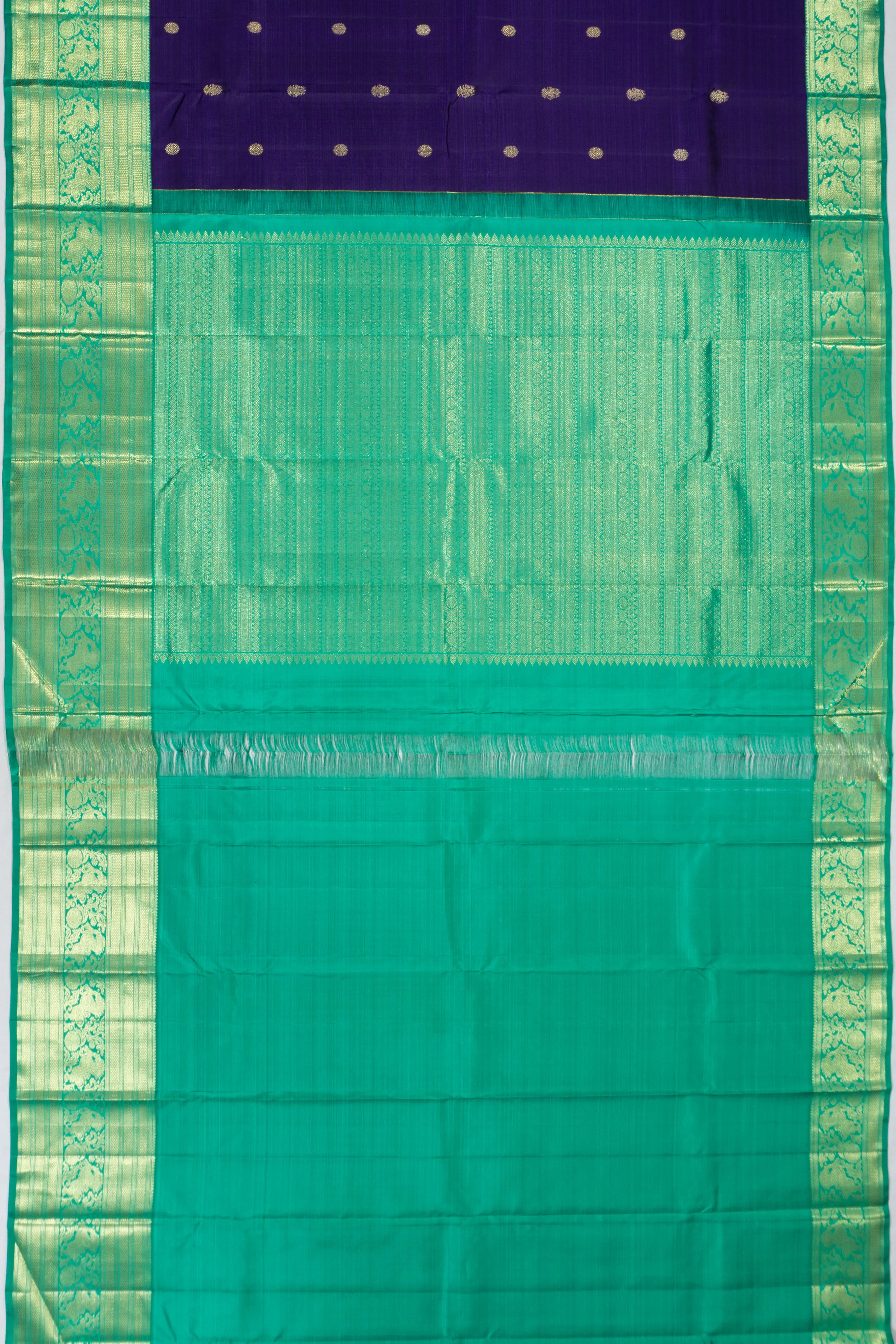 The saree is beautifully accentuated with a contrast gold zari brocade border in sea green, featuring intricately designed yali motifs nestled within floral vines
