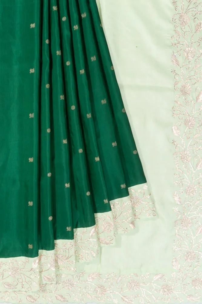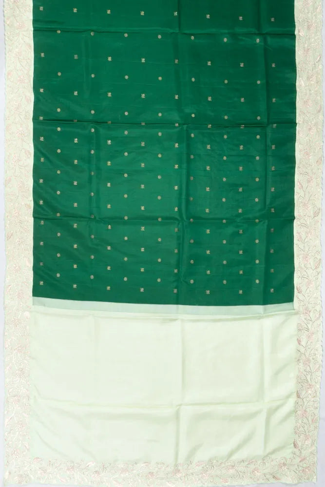 Dark green base gracefully highlighted with gold zari floral buttas interspersed with intricate peacock motifs, creating a regal visual appeal.