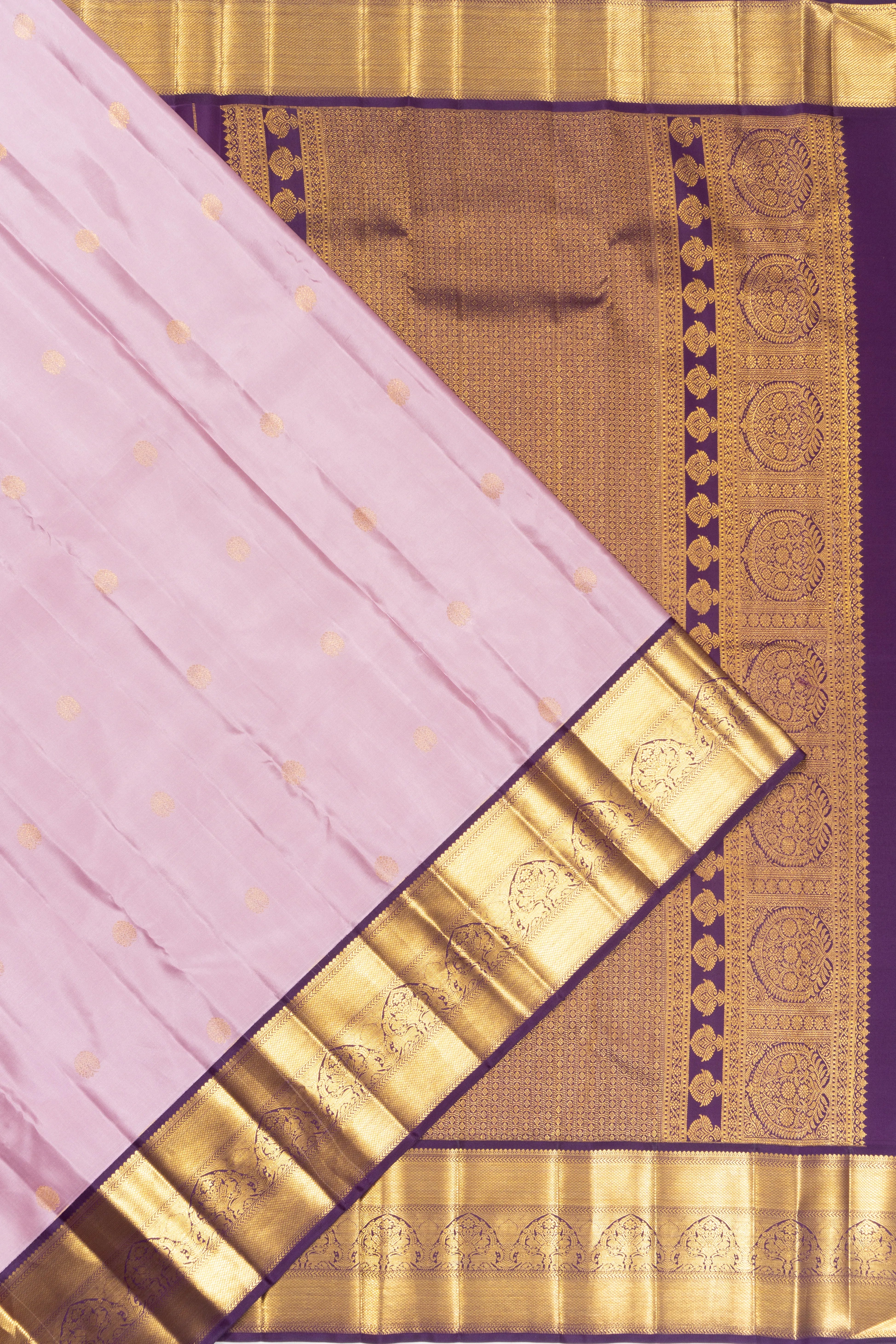 The saree features a purple border embellished with gold zari brocade, enriched with captivating peacock and yali motifs nestled among florals