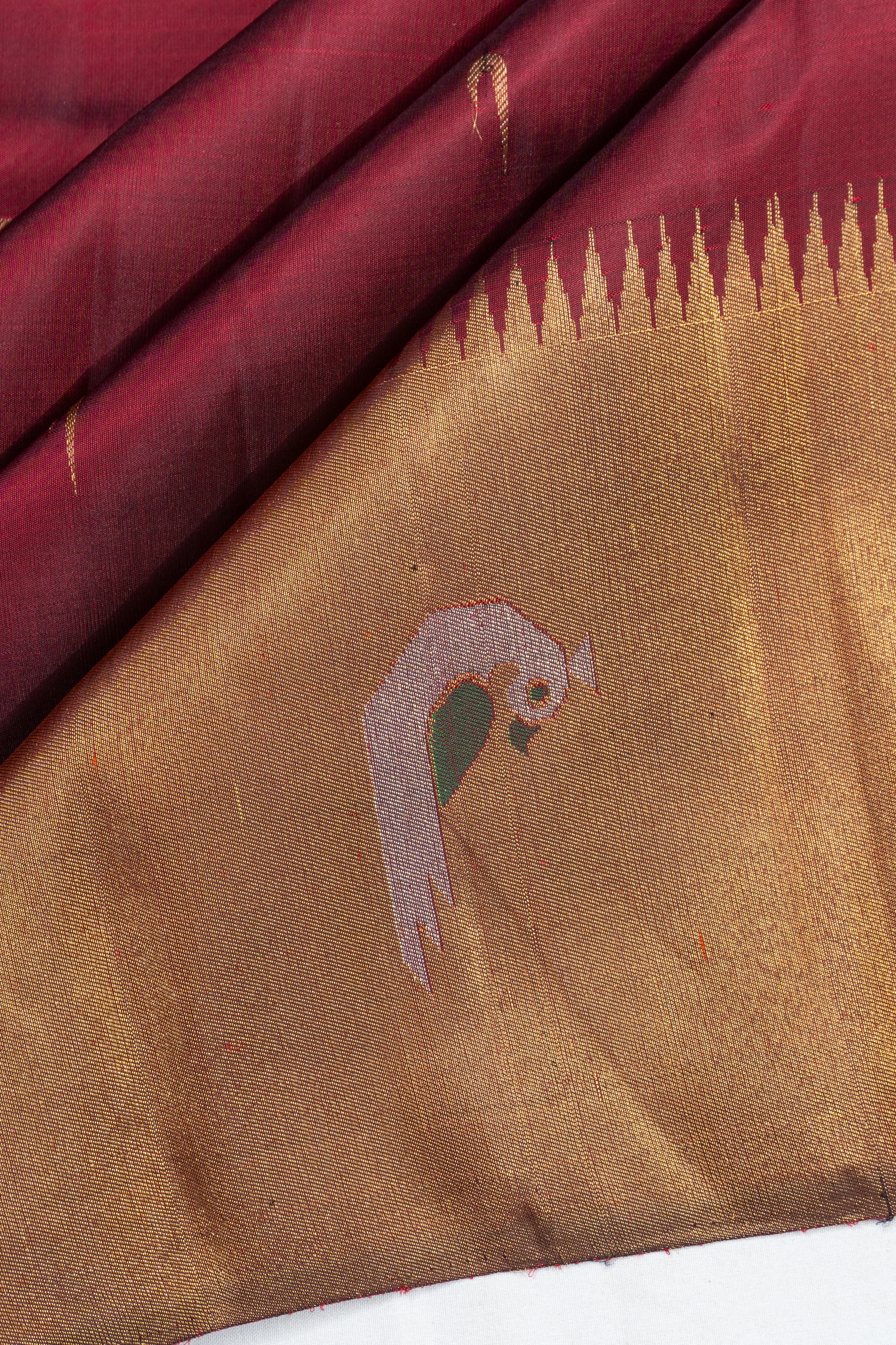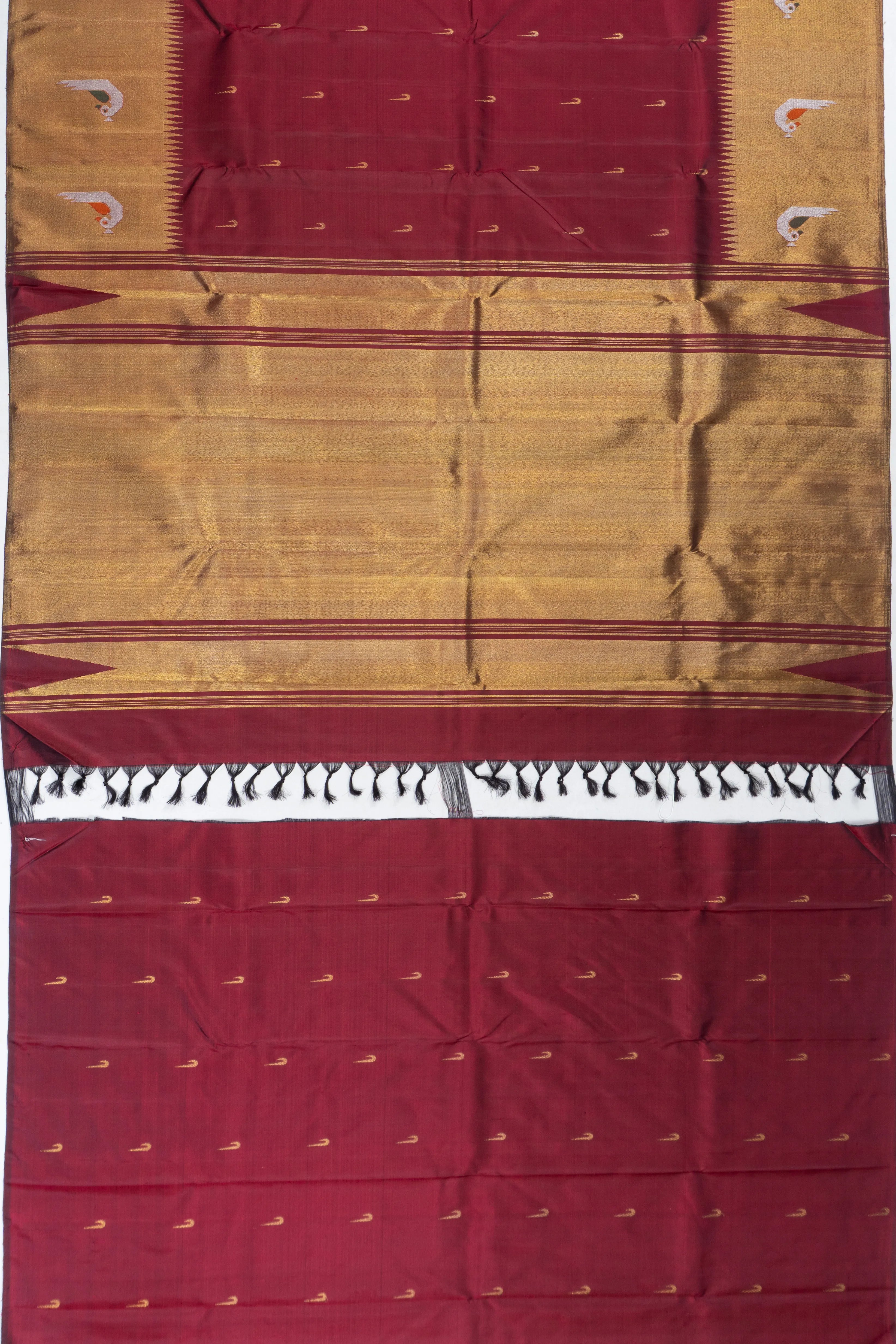 The maroon body is adorned with gold zari paithani-inspired muniya motifs, adding a touch of heritage to its luxurious silk fabric