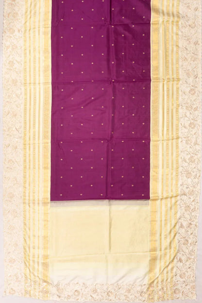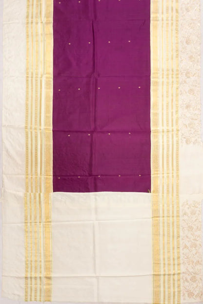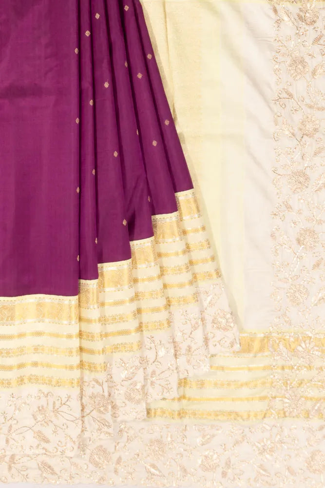 A regal purple base scattered with gold zari floral buttas, lending a timeless and rich texture to the drape.
