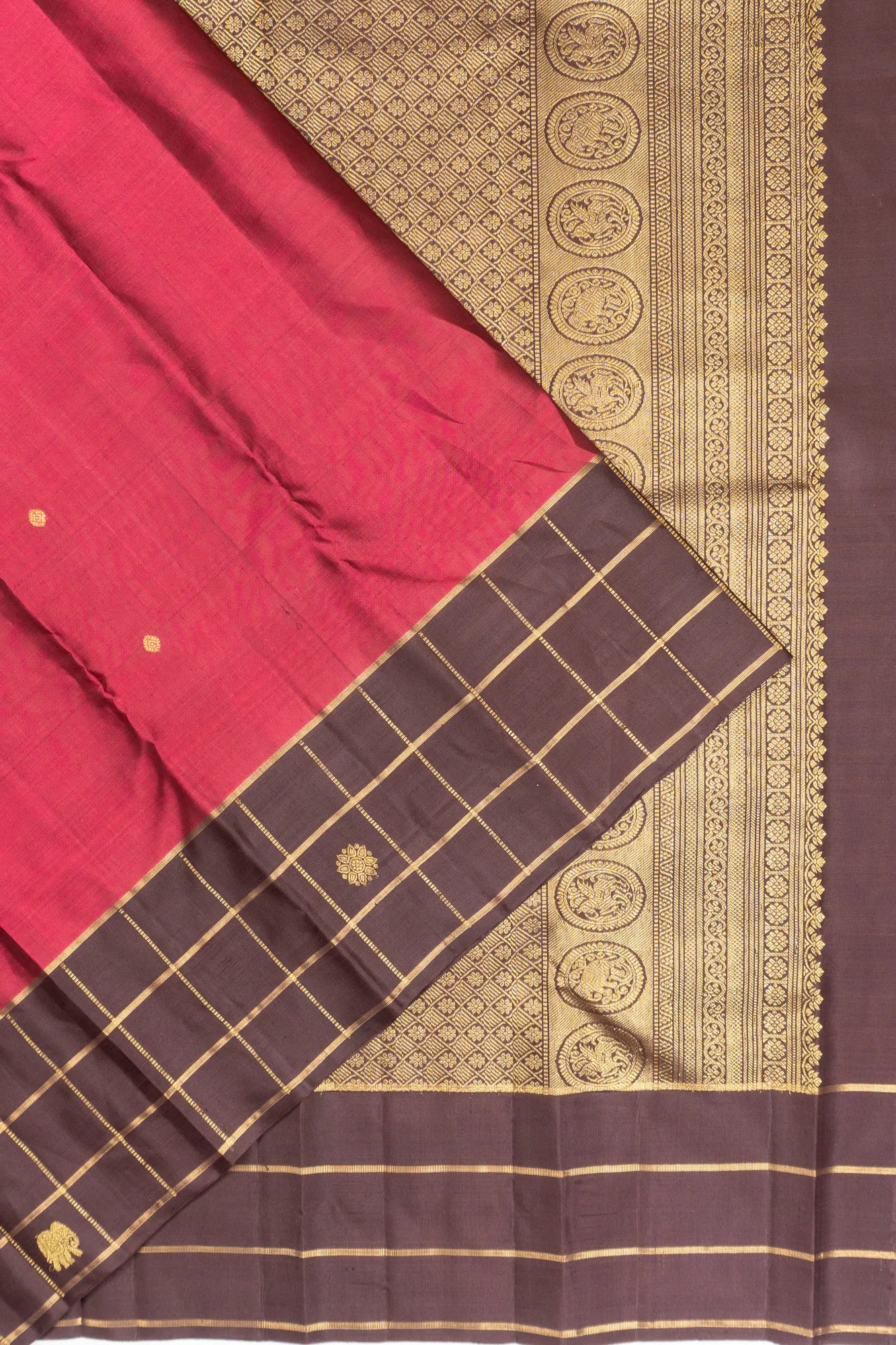 A cocho brown border, medium in size, adds a striking contrast with its gold zari checks and enchanting floral buttas, creating a harmonious balance with the rich red