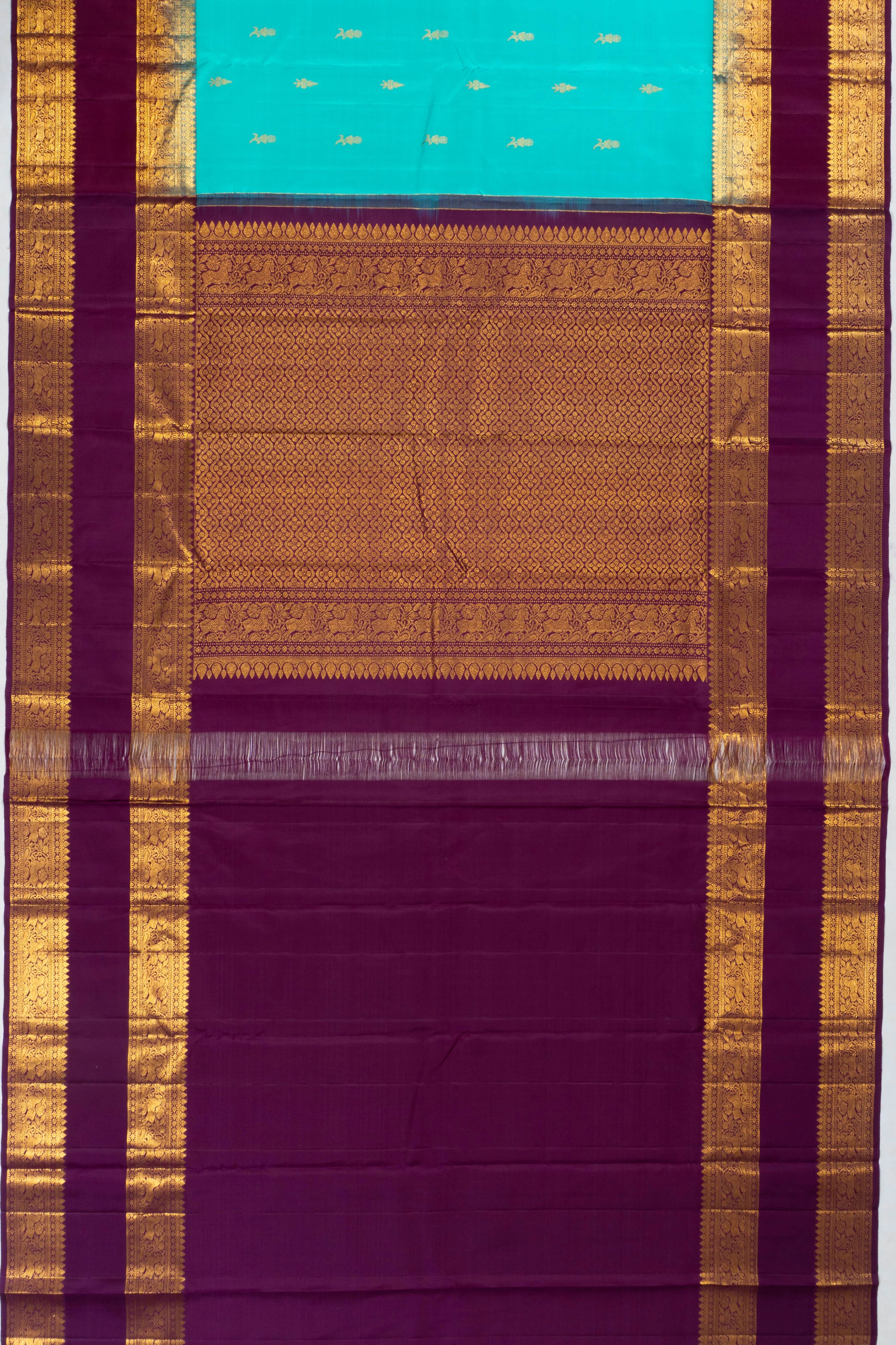 Accompanying the saree is a complementary purple blouse, finished with elegant zari borders, ensuring a refined and cohesive ensemble