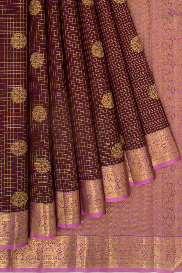 The contrast small lavender border in gold zari brocade features charming horse motifs The pallu complements the saree's elegance with its contrast gold zari brocade design Completing the ensemble is a contrast lavender plain blouse, epitomizing understated sophistication