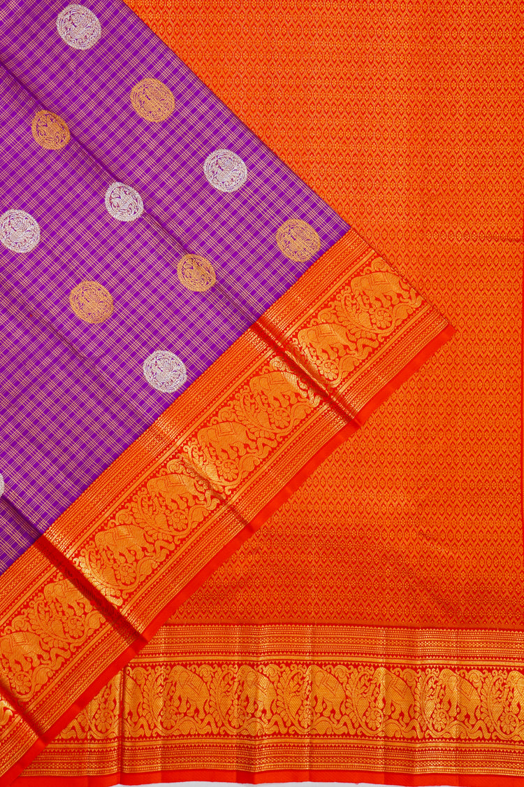 Rich purple body showcasing gold zari checks embellished with gold and silver zari floral butta of peacock and unicorn motifs, offering a regal and luxurious appearance.