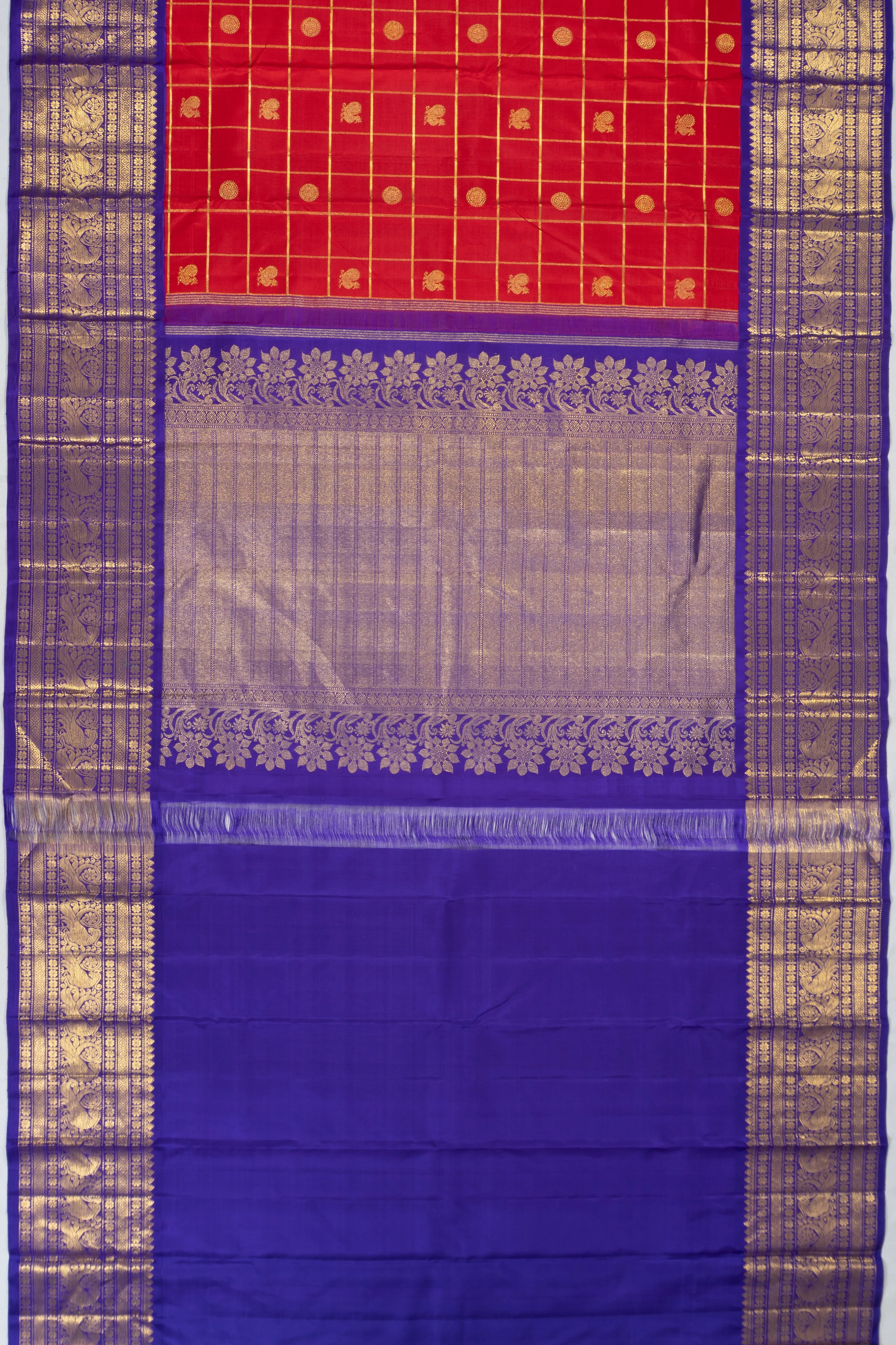 The rich red body is adorned with gold zari checks, featuring enchanting peacock and floral motifs that add a touch of regal sophistication