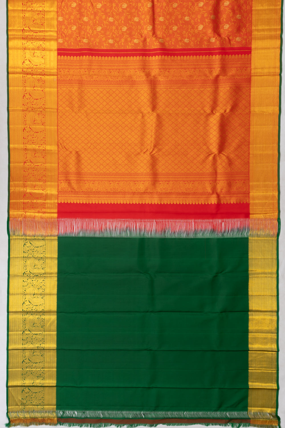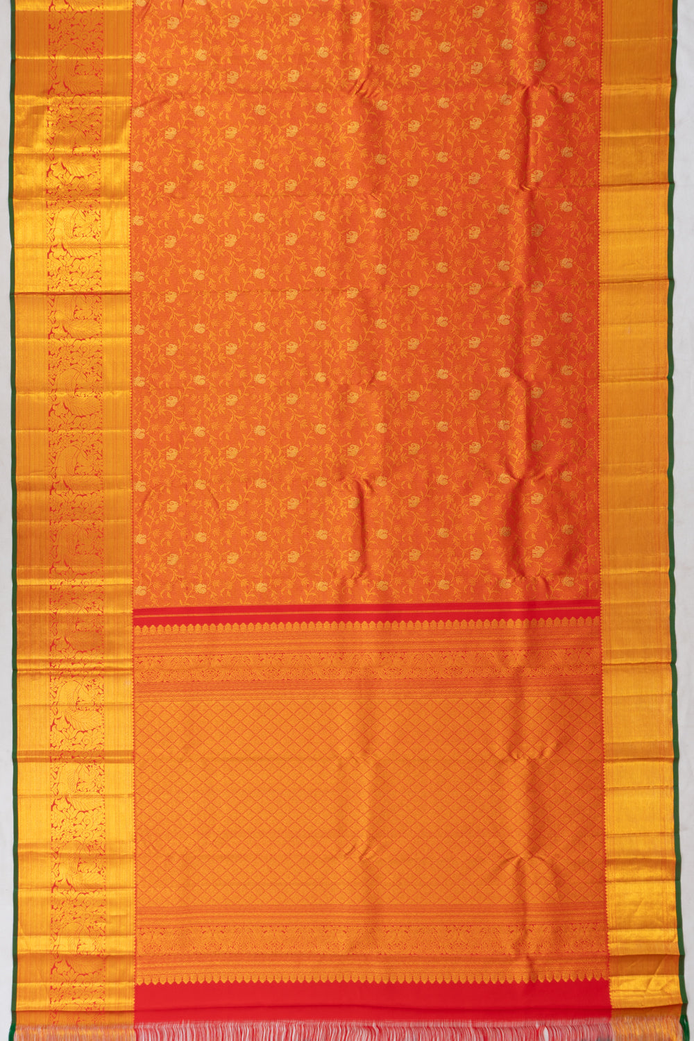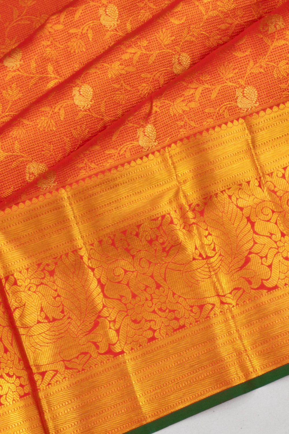 Self gold zari medium border with peacocks in floral, followed by a green edge.