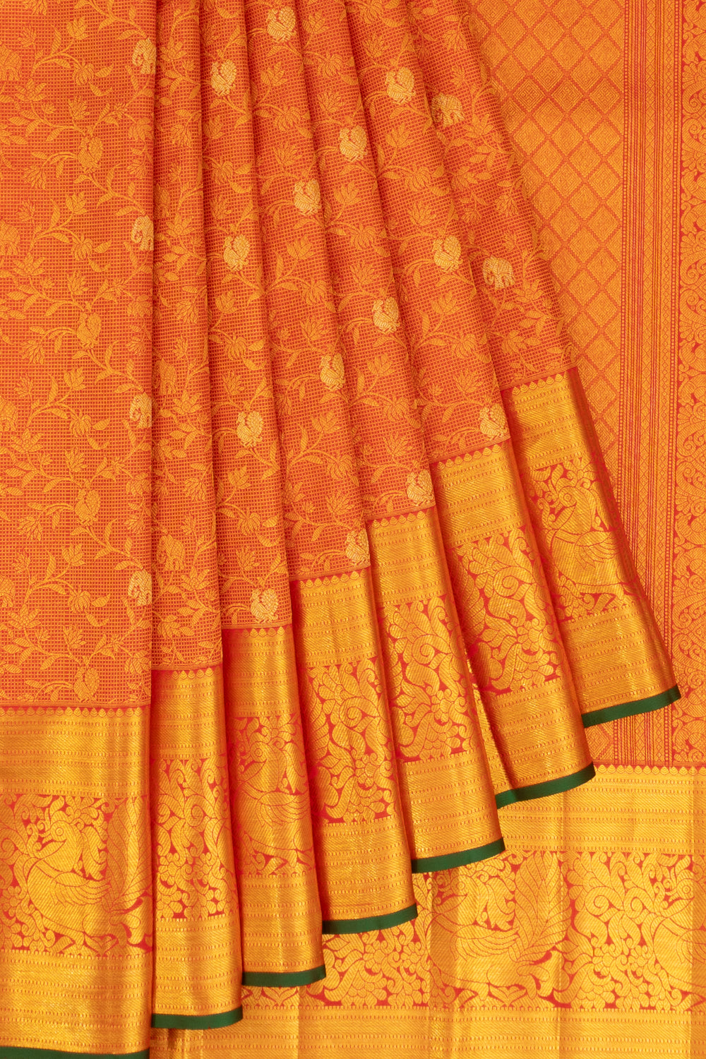 Self gold zari brocade pallu with peacock motifs in floral vines, extending the opulent feel from the border into the pallu.