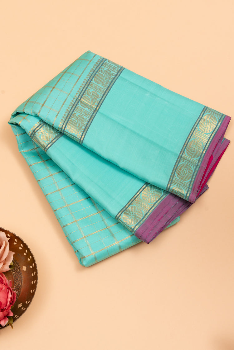 The saree features gold zari checks on the body and a self rettai pattu medium border adorned with rudraksha motifs, followed by a beautiful purple edge The pallu showcases a stunning self gold zari brocade design It comes with a contrast plain pink blouse with borders, adding a touch of elegance to the overall look Ideal for those who prefer a vibrant color palette for their special occasions