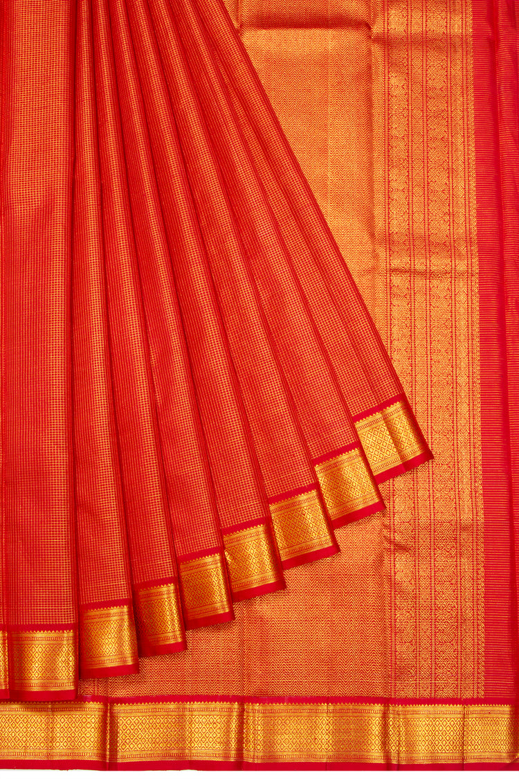 A striking red base intricately woven with gold zari checks, adding a classic and sophisticated texture.