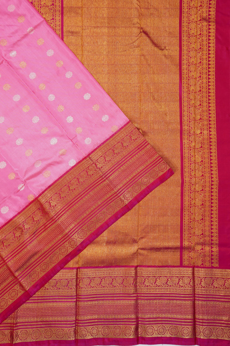 The body of this saree showcases gold and silver zari floral butta on a pink base, offering a delicate and elegant design.