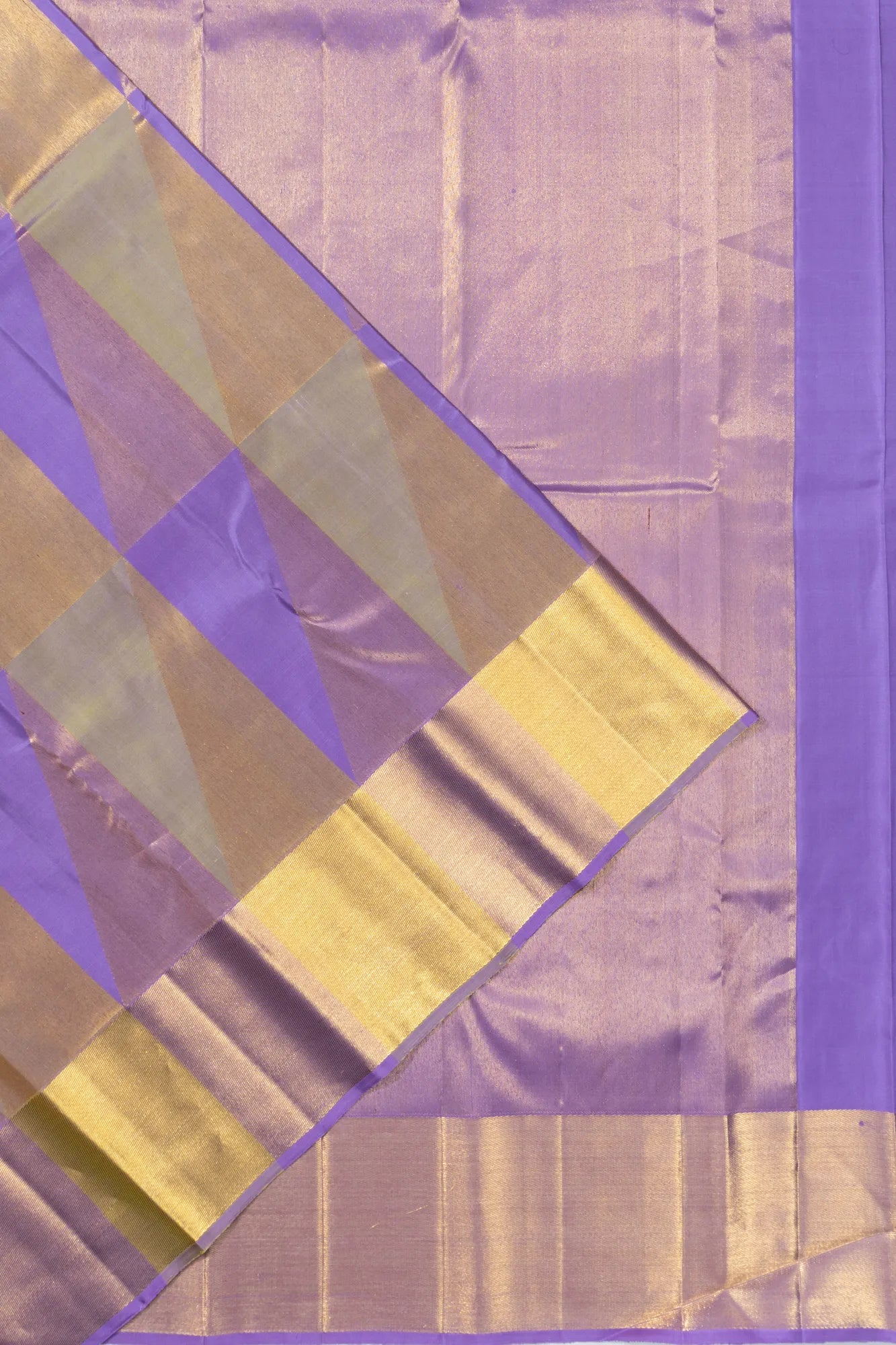 This violet Kanchipuram silk saree features shimmering gold zari geometrical brocade, adding a bold, contemporary touch to its traditional foundation.