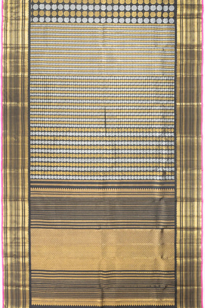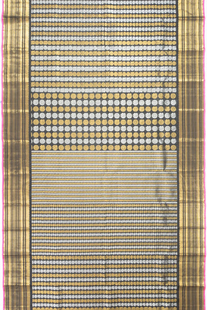 Sophisticated self pallu with gold zari vertical lines and intricate geometrical brocade—a modern take on traditional weaving.