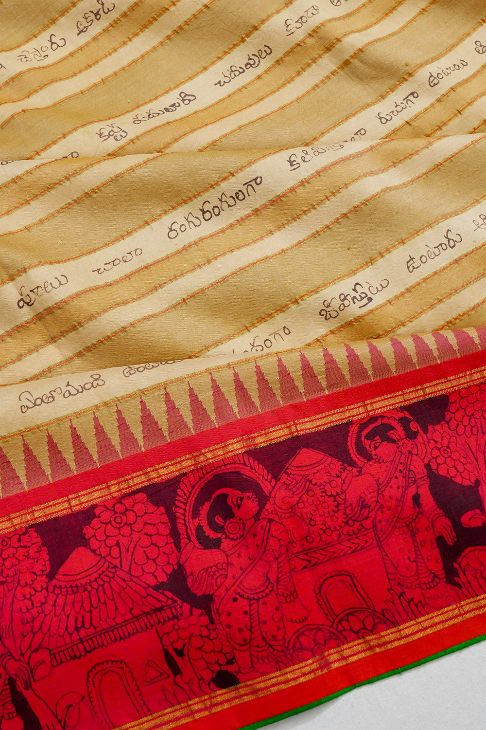 Kanchipuram Silk Handpainted Kalamkari Ramayanam Cream Saree