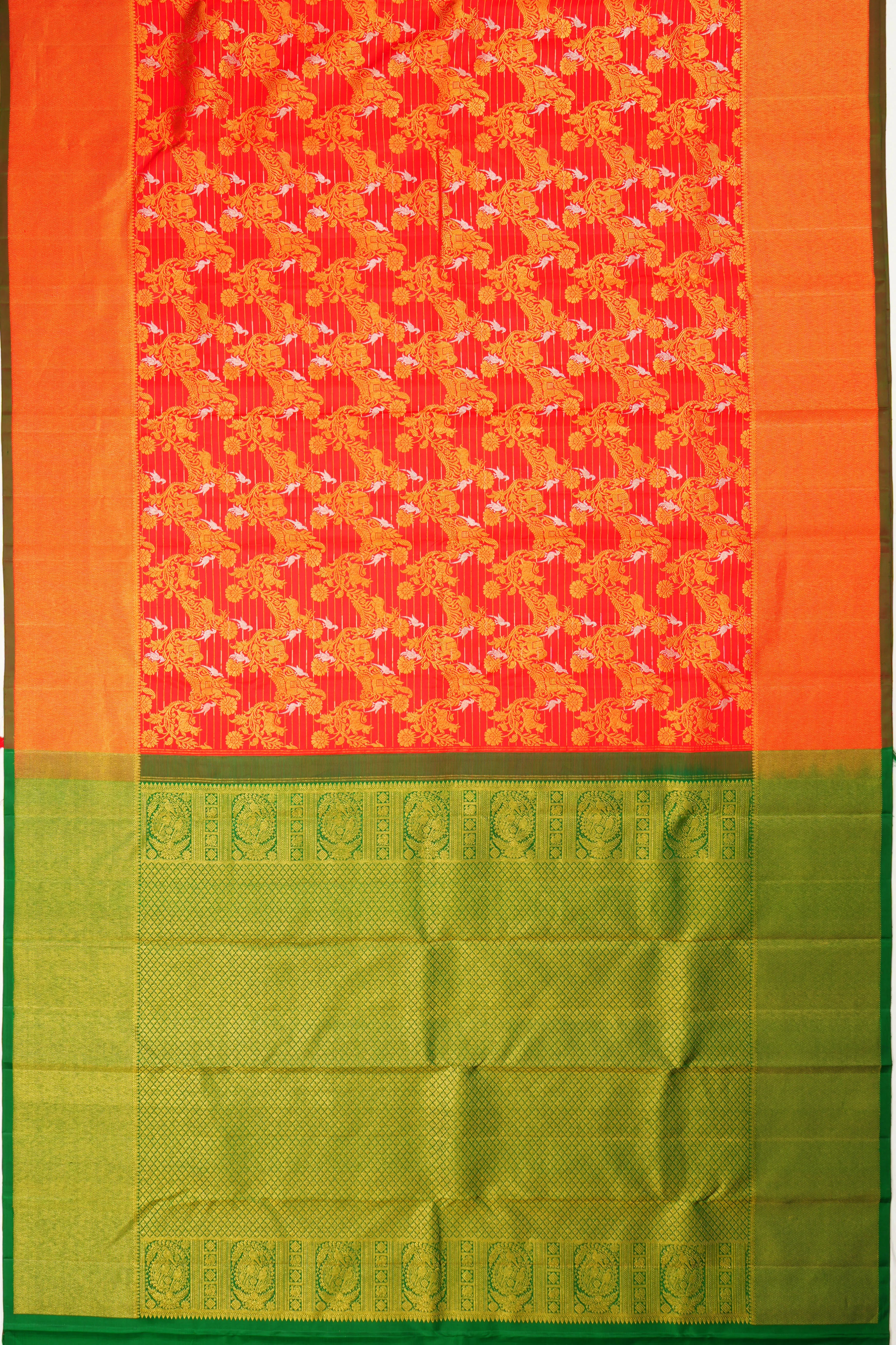 This striking red saree features gold zari horizontal lines, combined with a floral jaal design, enriched with animal motifs and silver zari bird motifs interspersed throughout, adding texture and richness.