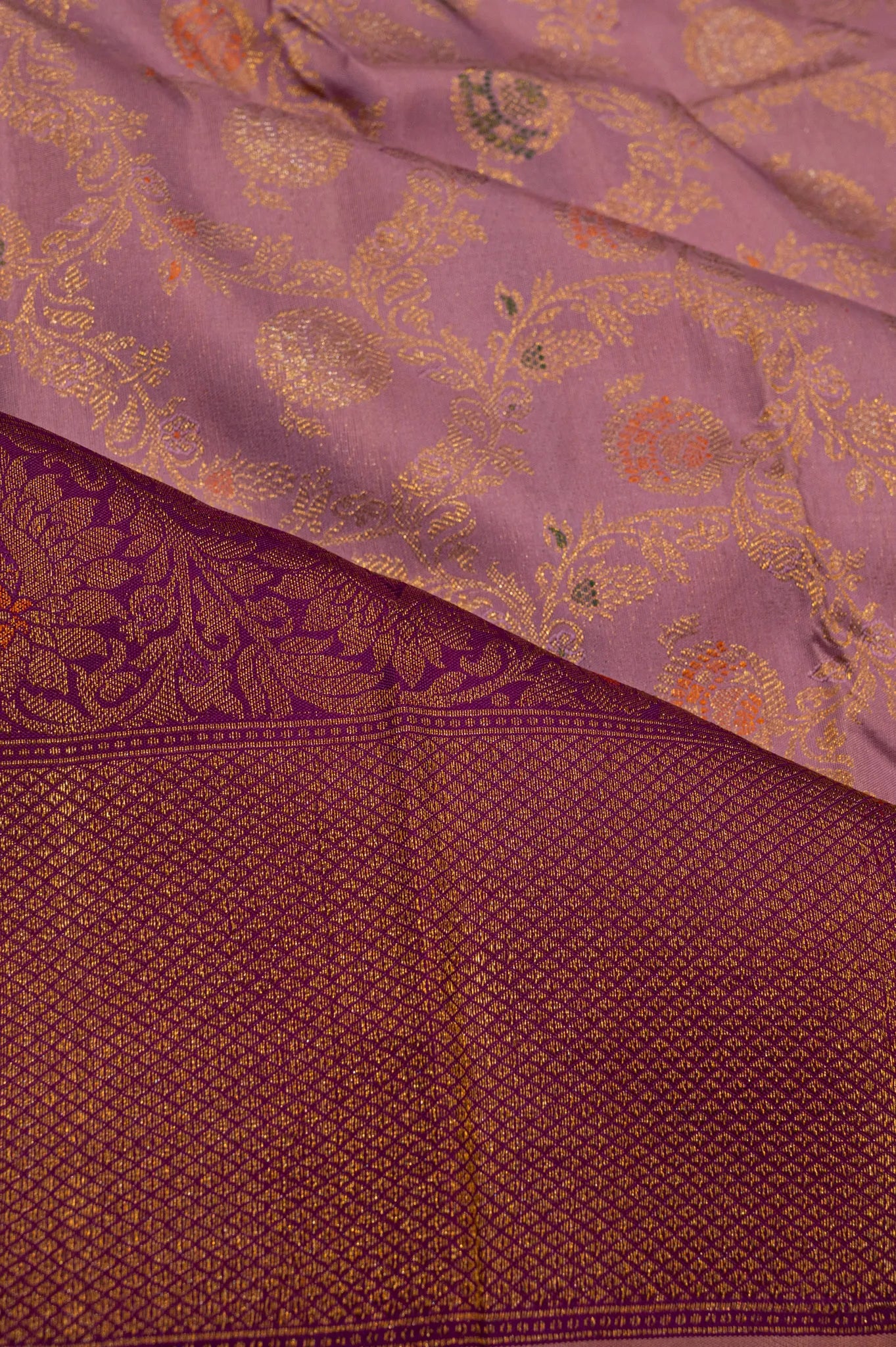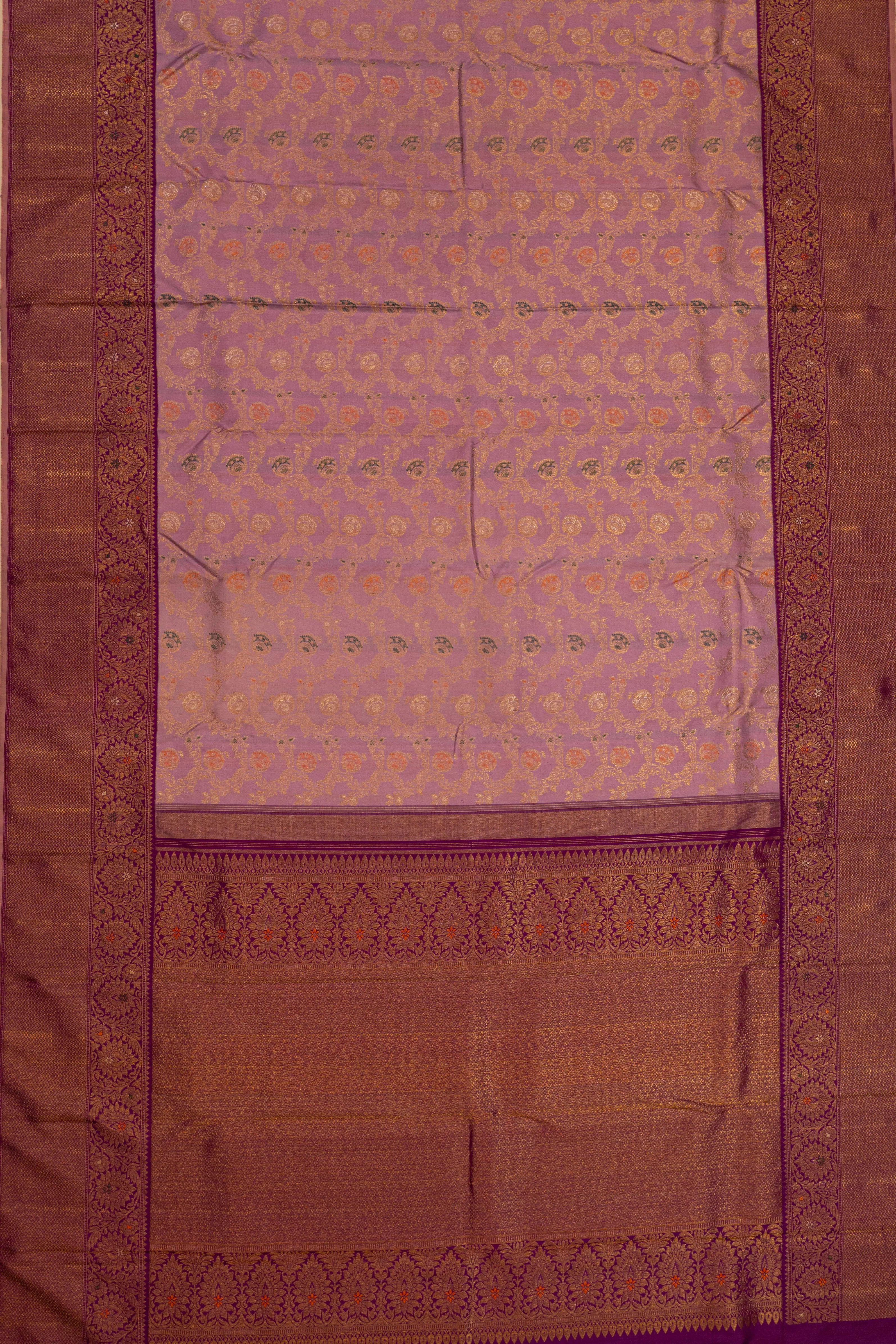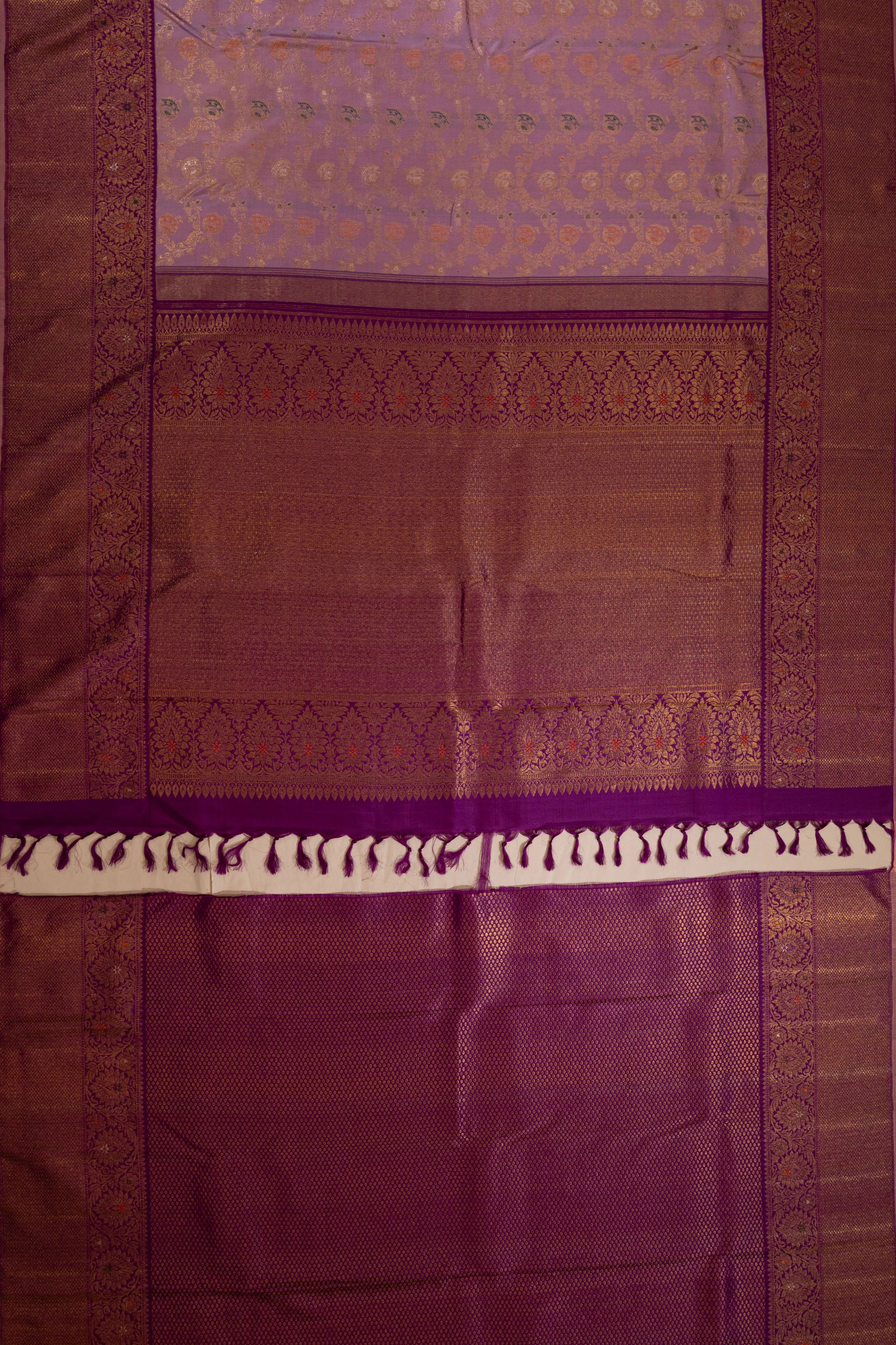 A coordinated gold zari floral brocade pallu with intricate floral vines completes this ensemble, alongside a purple blouse featuring elegant zari borders