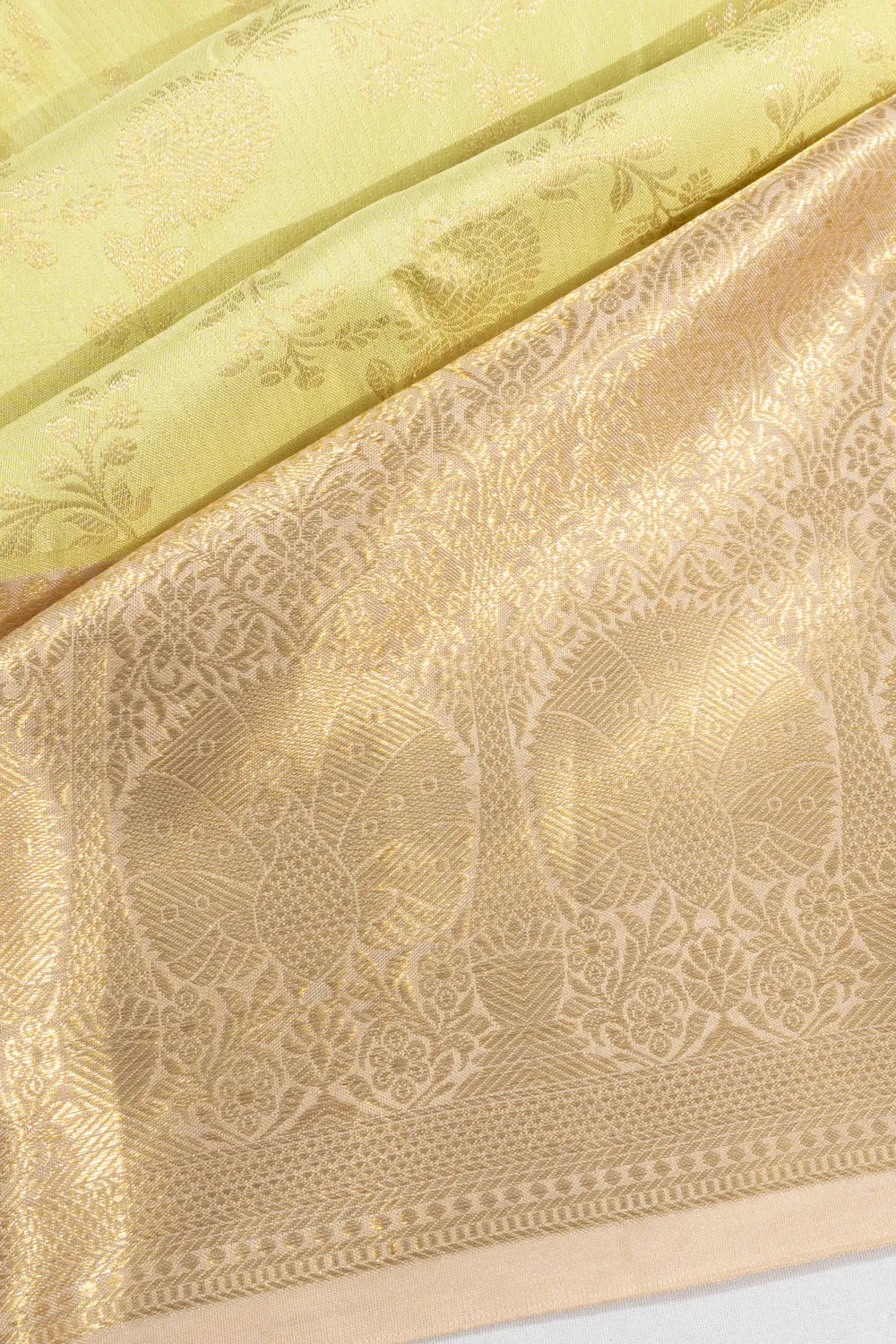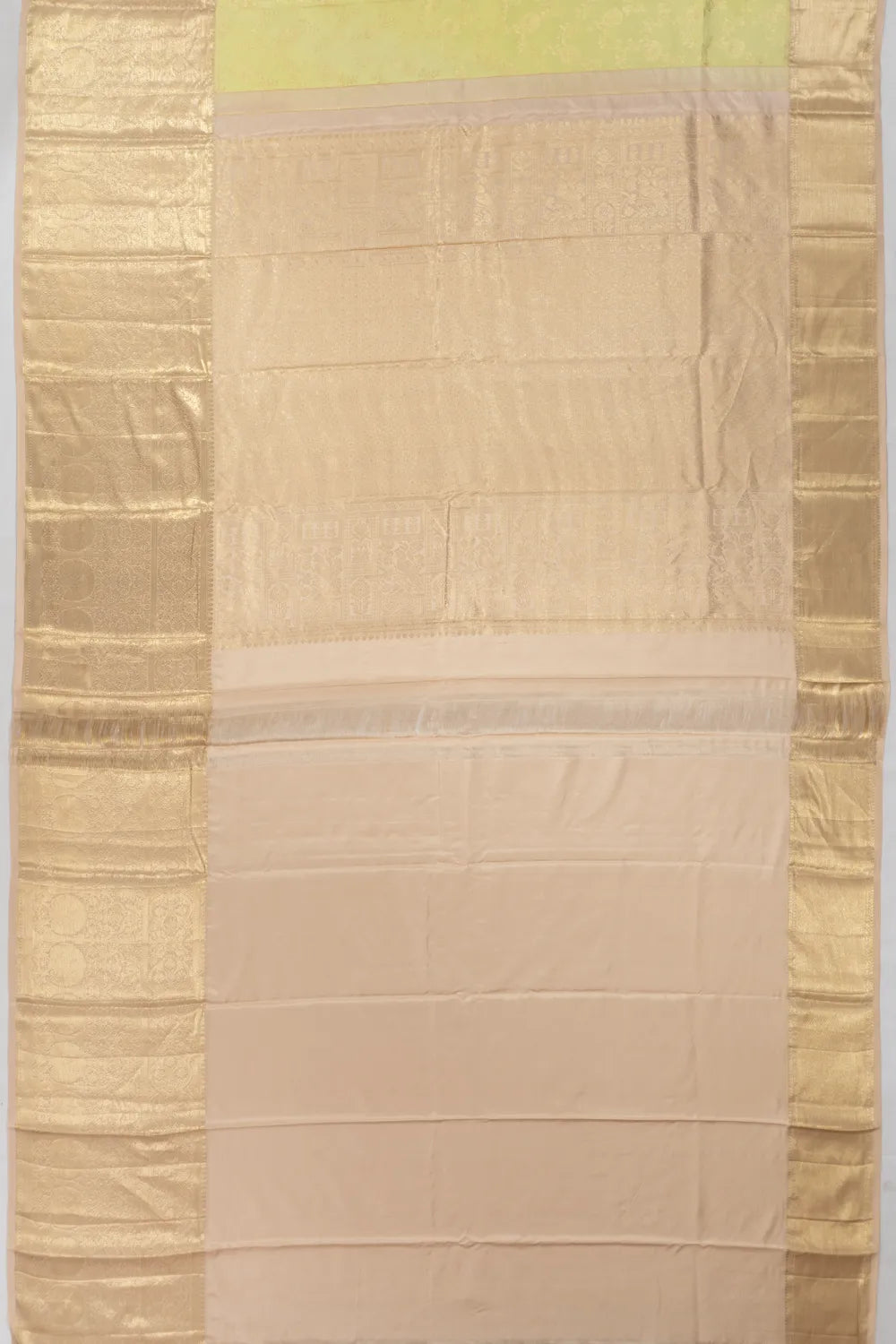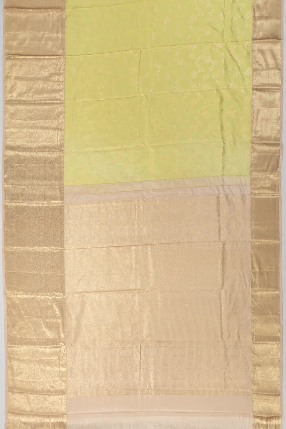 Body: Pastel green silk with intricate gold zari floral jaal work.