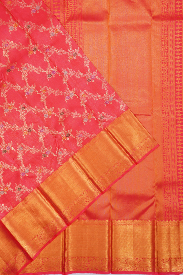 Crafted with a stunning gold zari floral jaal, this saree features multicolour meenakari, resulting in a captivating and lively appearance.