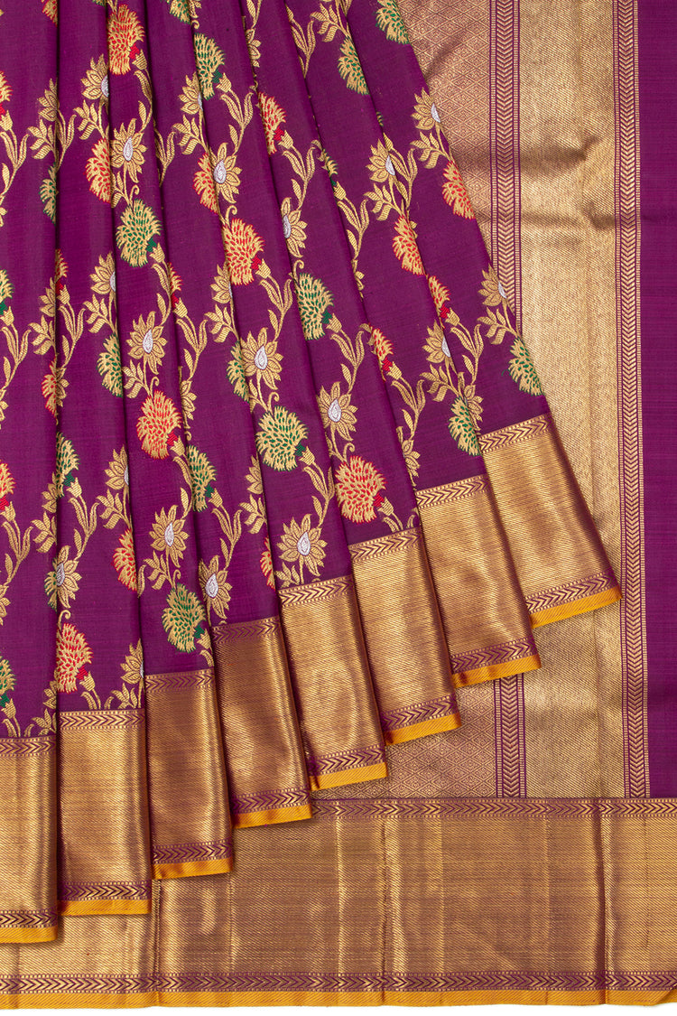 Unveil the majesty of our Pure Zari Kanchipuram Silk Jaal Purple Saree, featuring a splendid gold zari floral jaal adorned with vibrant orange and green meenakari work The self gold zari kaddi medium border is enriched with a yellow edge, adding a touch of finesse The pallu showcases an exquisite self gold zari brocade design Complementing the saree is a self plain blouse with intricate zari borders