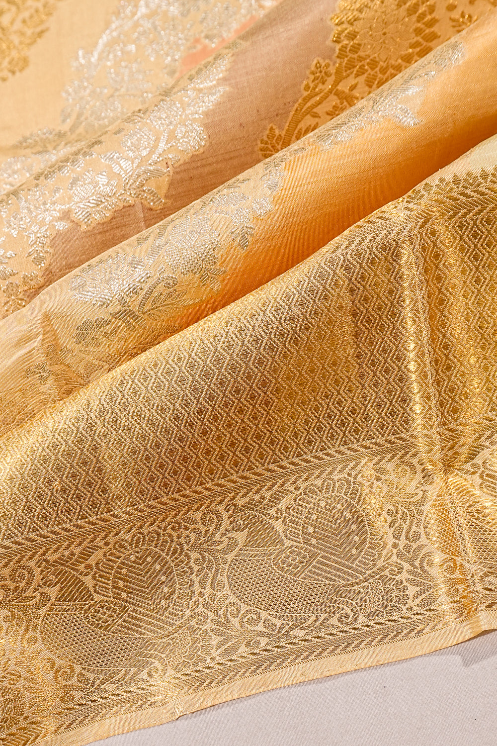 The self gold zari brocade medium border with peacock motifs in florals brings a