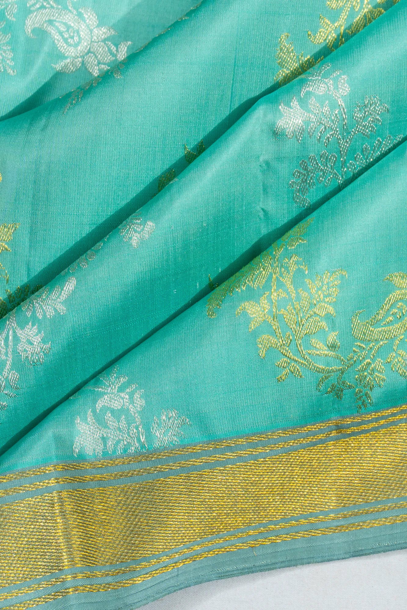Contrasting peacock‑green blouse detailed with tiny zari hand motifs along the sleeves, adding a hint of traditional charm and color harmony.