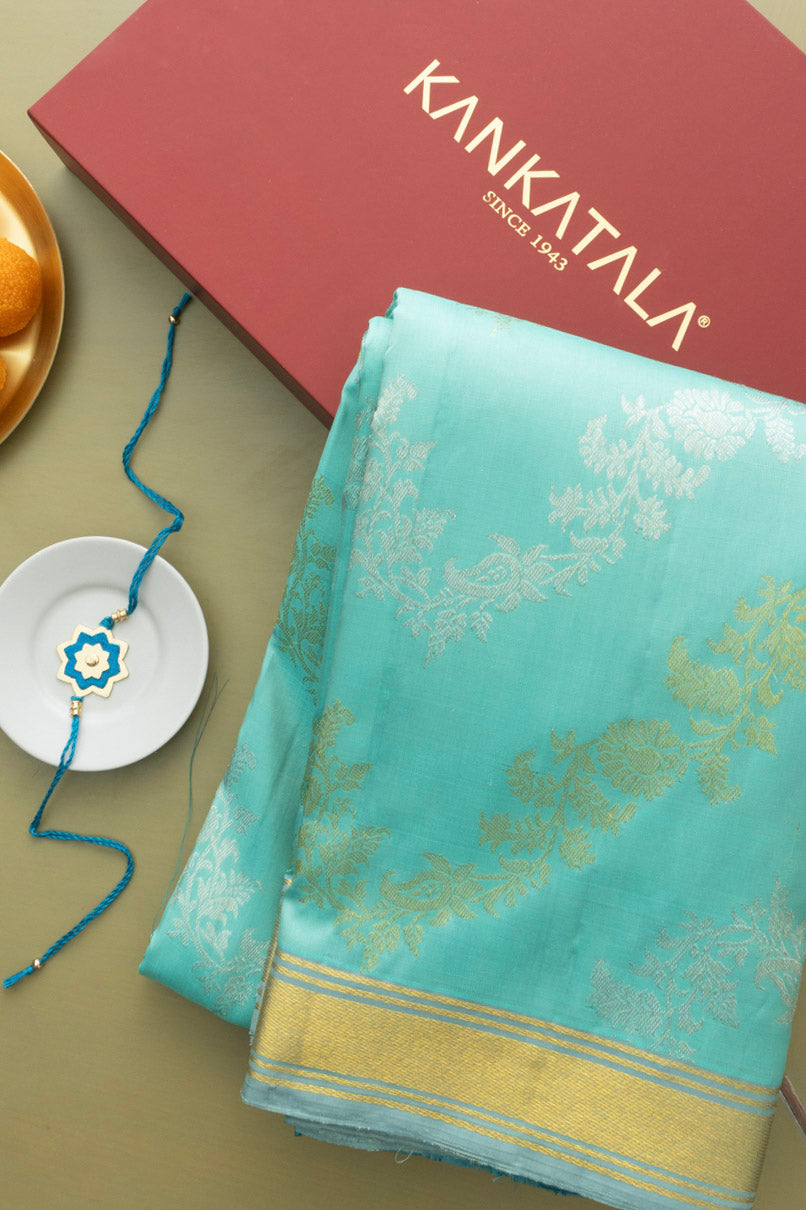 Self small kaddi zari border in a minimalist design—subtle yet striking, it frames the saree without detracting from the body’s fluid artistry.