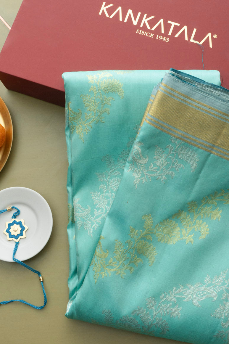 A serene sky‑blue base woven in the classic lehariya wave pattern, intricately interlaced with delicate floral vine motifs that dance across the fabric.