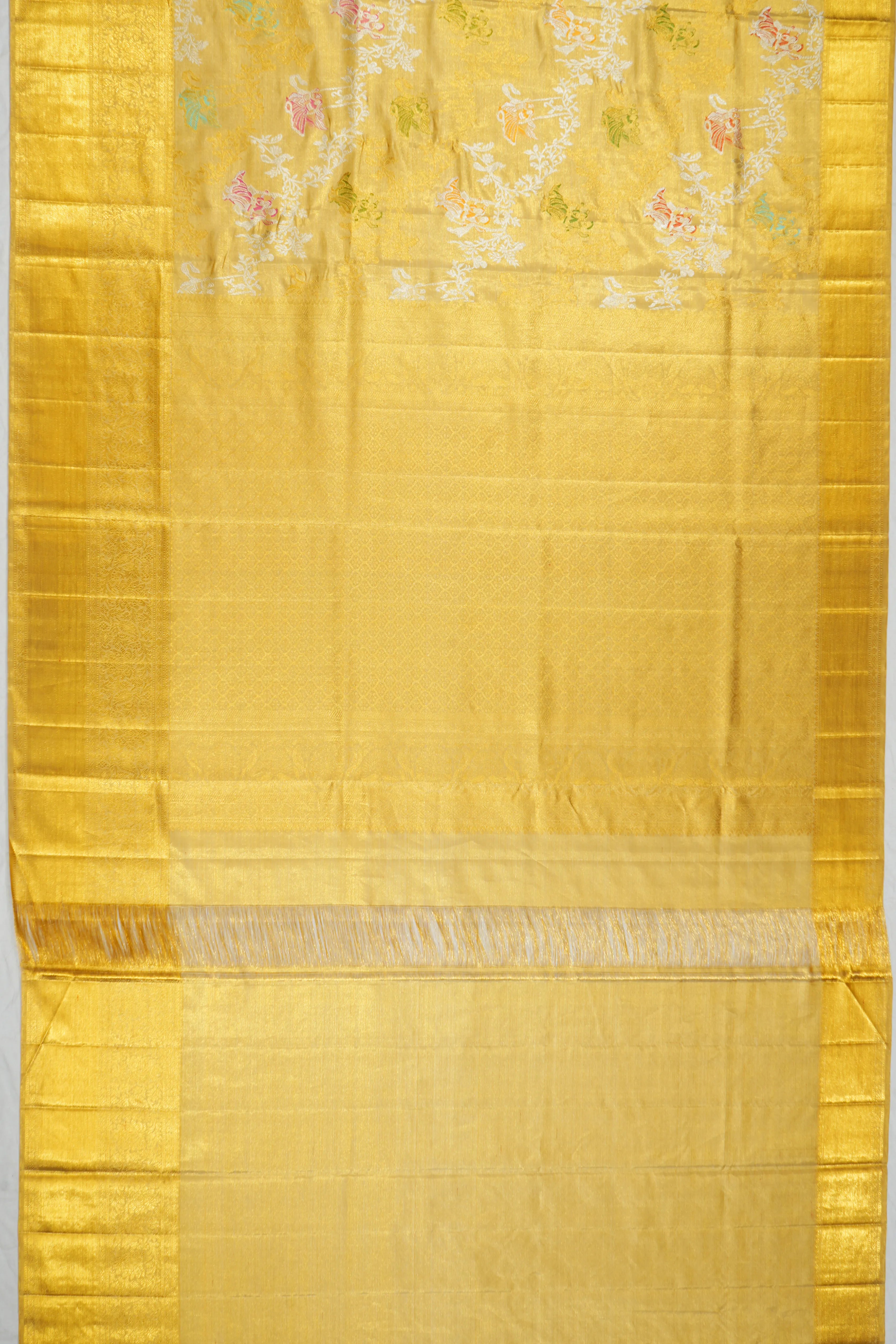 Kanchipuram Silk Meenakari Jaal Tissue Gold Saree With Radha Krishna Motifs
