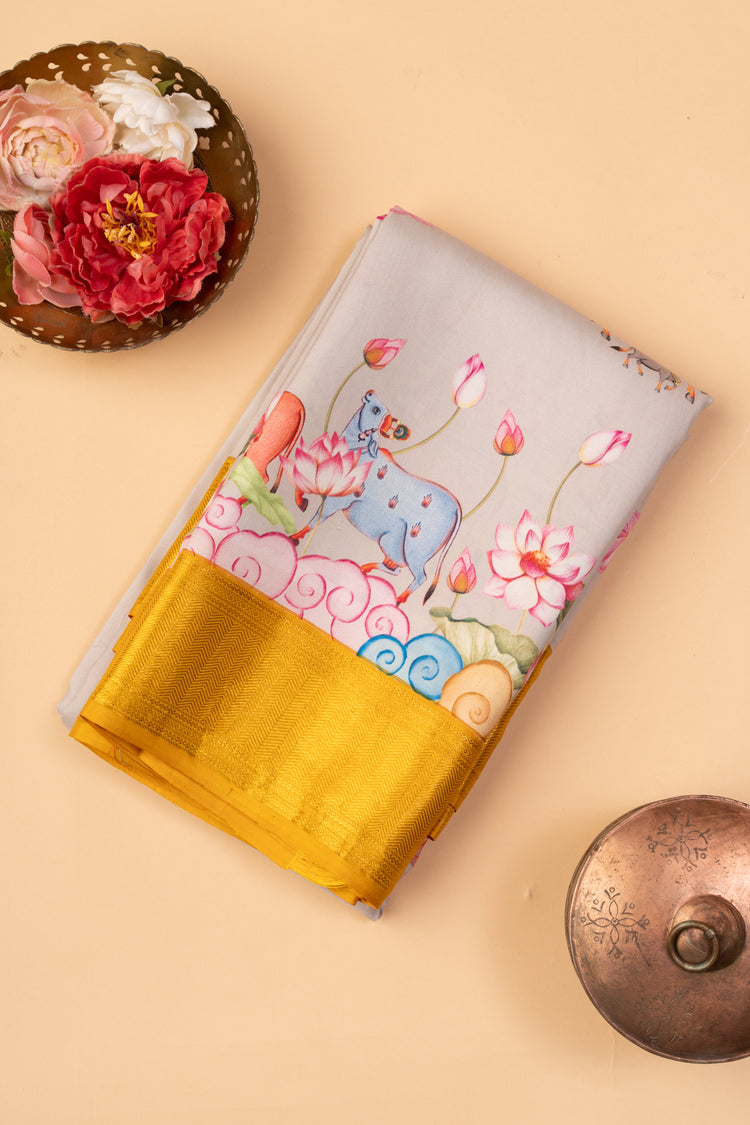 Kanchipuram Silk Pichwai Printed Grey Saree