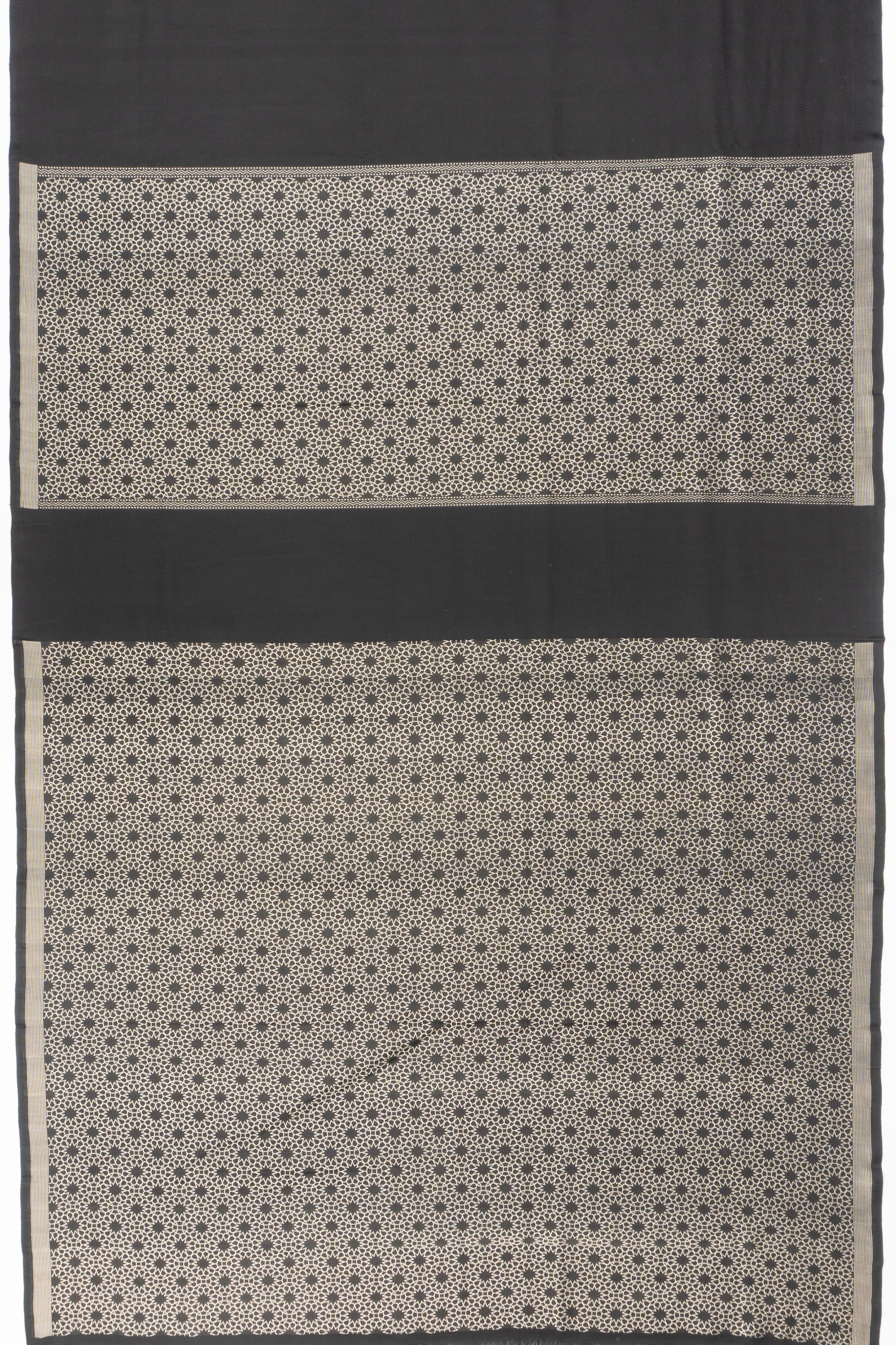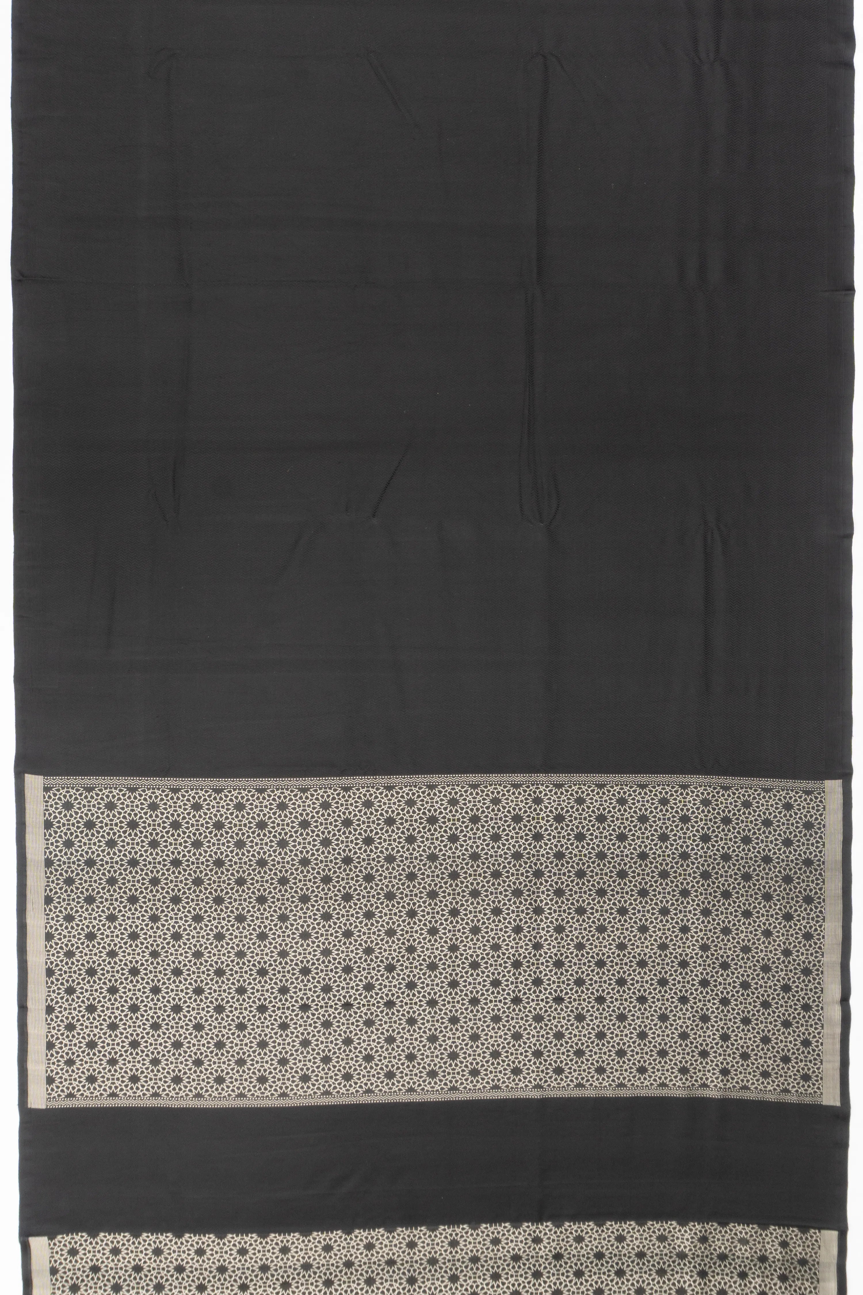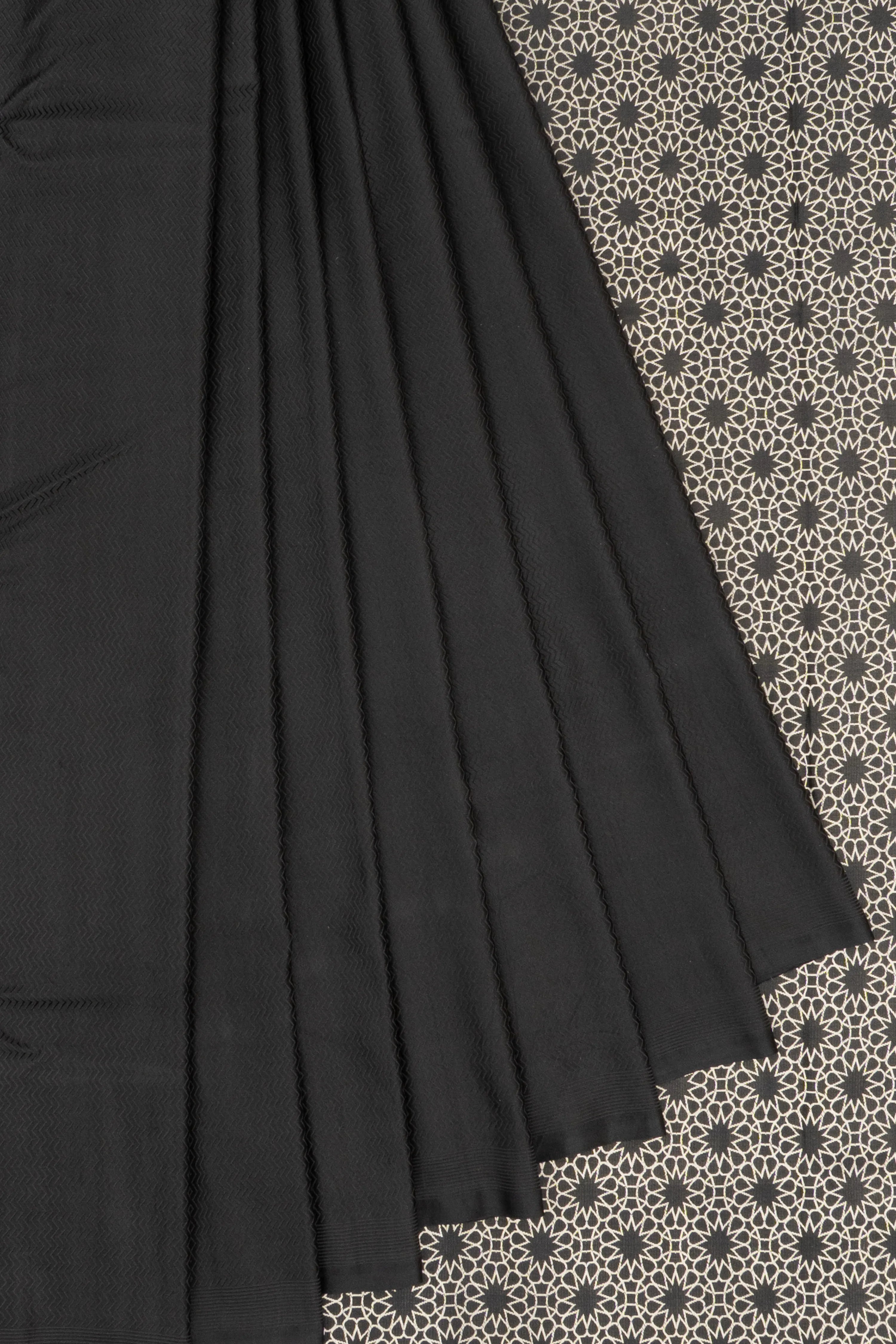 The saree features a pure, unembellished black silk body, offering a minimalist yet regal appeal.